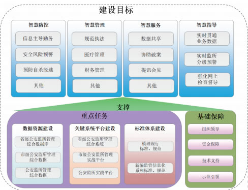 Public security intelligent supervision construction adheres to information led service, strengthens security risk control, and focuses on building a "1+2+3+4" intelligent supervision construction system. "1" refers to the "provincial integrated practical application platform", "2" refers to the "two basic resources support of police cloud and big data application", and "3" refers to the "three-level practical command center of provincial and municipal public security supervision departments and prisons", "4" refers to the smart regulatory framework system of "four smart application systems: smart prevention and control, smart management, smart service and smart guidance".