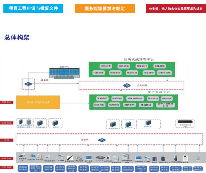 智慧监所建设严格按照公监管【2018】209号文《关于推进智慧监管建设的指导意见》和《智慧监管建设技术指南》等有关规定和要求,充分依托公安网和警务综合平台,贯彻“科技强警”战略,建立统一的智慧监管监所实战应用平台,服务于监所的管理与安全。