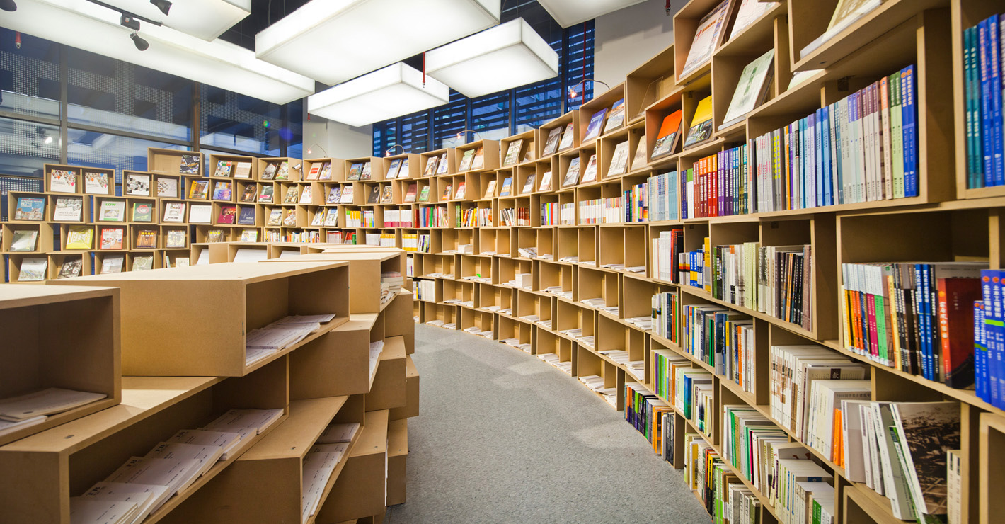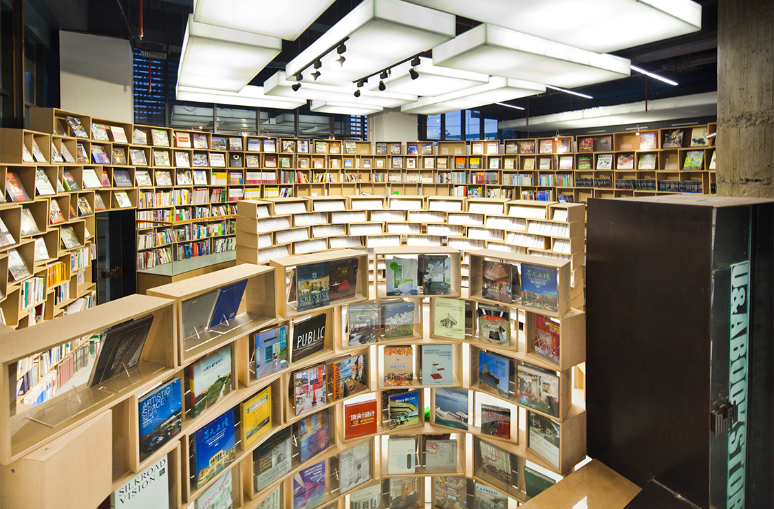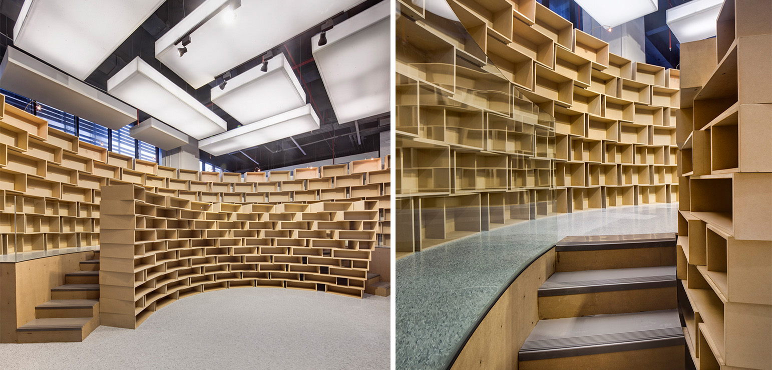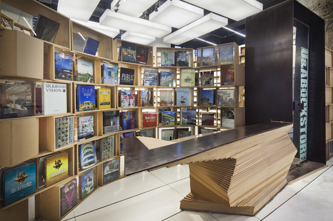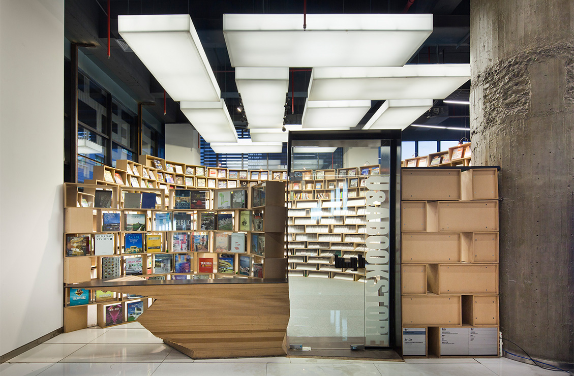 建筑书店融入在同济规划大厦的门厅中,使书店成为了规划师与建筑师生活的重要组成部分。书店与咖啡厅和餐厅一起构建了设计师生活与休闲的场所。爱书、爱设计,是该项目设计的出发点,由多个不同尺度的“书盒子”在参数化设计方法引导下所垒砌而成的书架空间带给了读者强烈的围聚感,这是通往崇高知识殿堂的途径。“书盒子”将书架砌筑变成了一个“平原”与“高原”交错的地景:一个被全景式书架包围的“平原”空间,和一个被两排书架限定的“高原”空间。书架上的每一个格子向入口处扭转,站在入口的人会感觉所有书架在“欢迎”他,借此营造一种较为内向的适于静思的气氛。