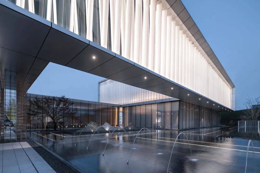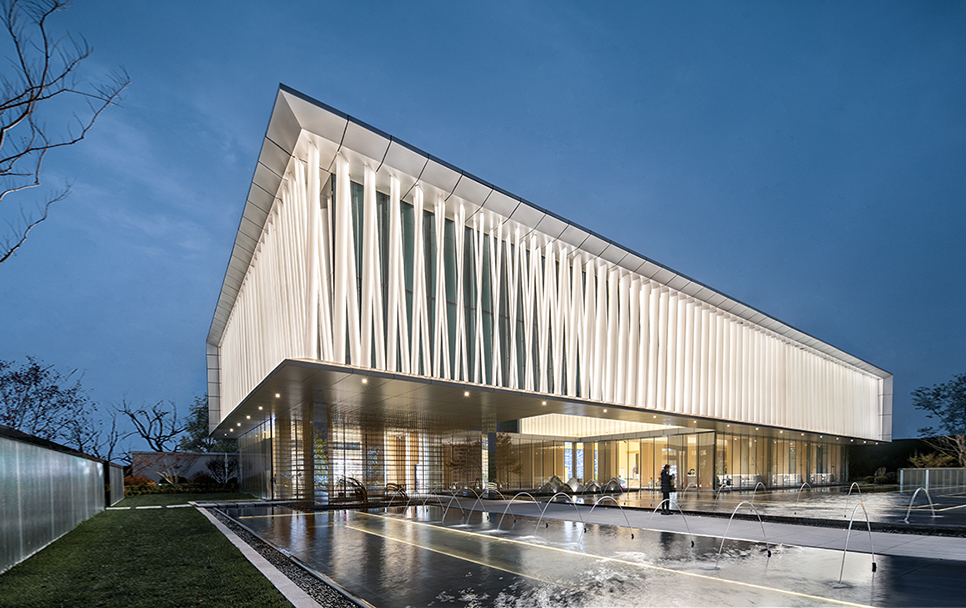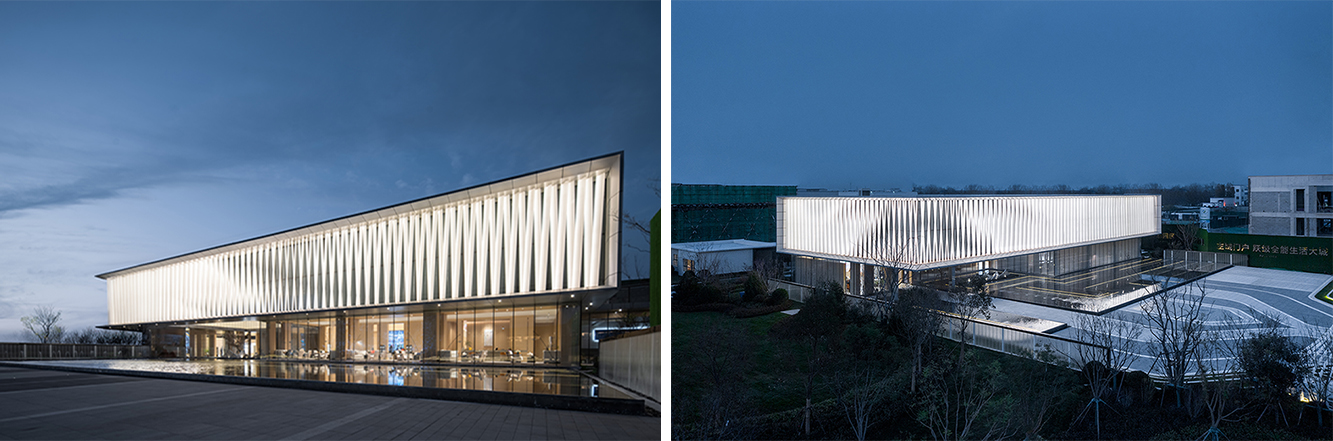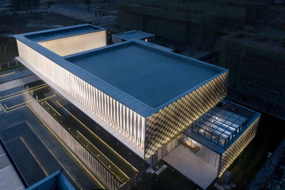 为了打造缥缈梦幻的意境,项目选材上以素雅通透的材料为主。展示中心建筑两层体量,首层外观为极致的通透玻璃,二层为银白色金属框镶嵌喷砂半通透的发光参数化U玻、晶亮聚碳酸酯板。