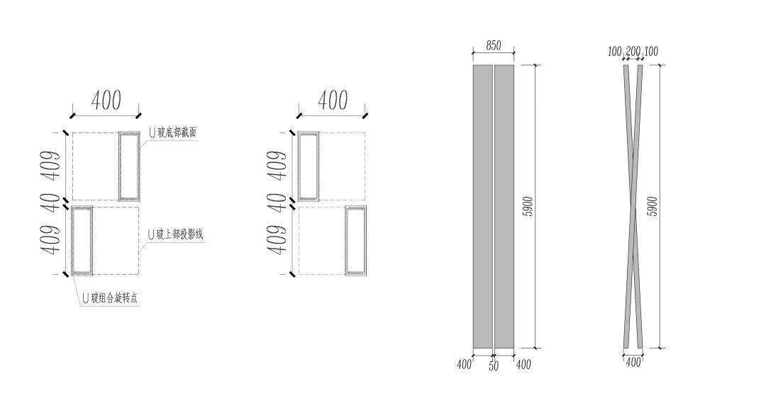 U玻为标准化玻璃型材,单玻立面上墙,侧边法兰露出,效果难以控制。本次采用U玻双扣形成玻璃套筒,保证各个角度上外效果统一。对于灯光的处理,因立面上U玻是与衬玻璃相脱离,藏灯、维修未来会是主要难点。