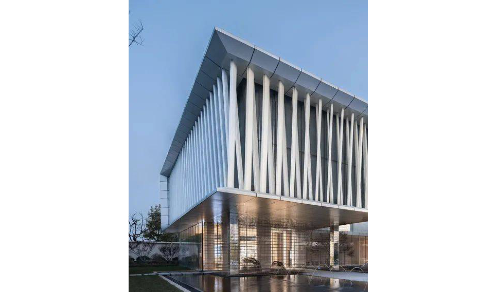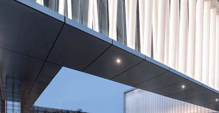 In order to improve the space feeling of near human scale, we choose to use high composite aluminum plate with higher flatness at the outdoor ceiling on the first floor, and adopt the treatment method of embedded molding in the groove at the dripping position to make the building more delicate.