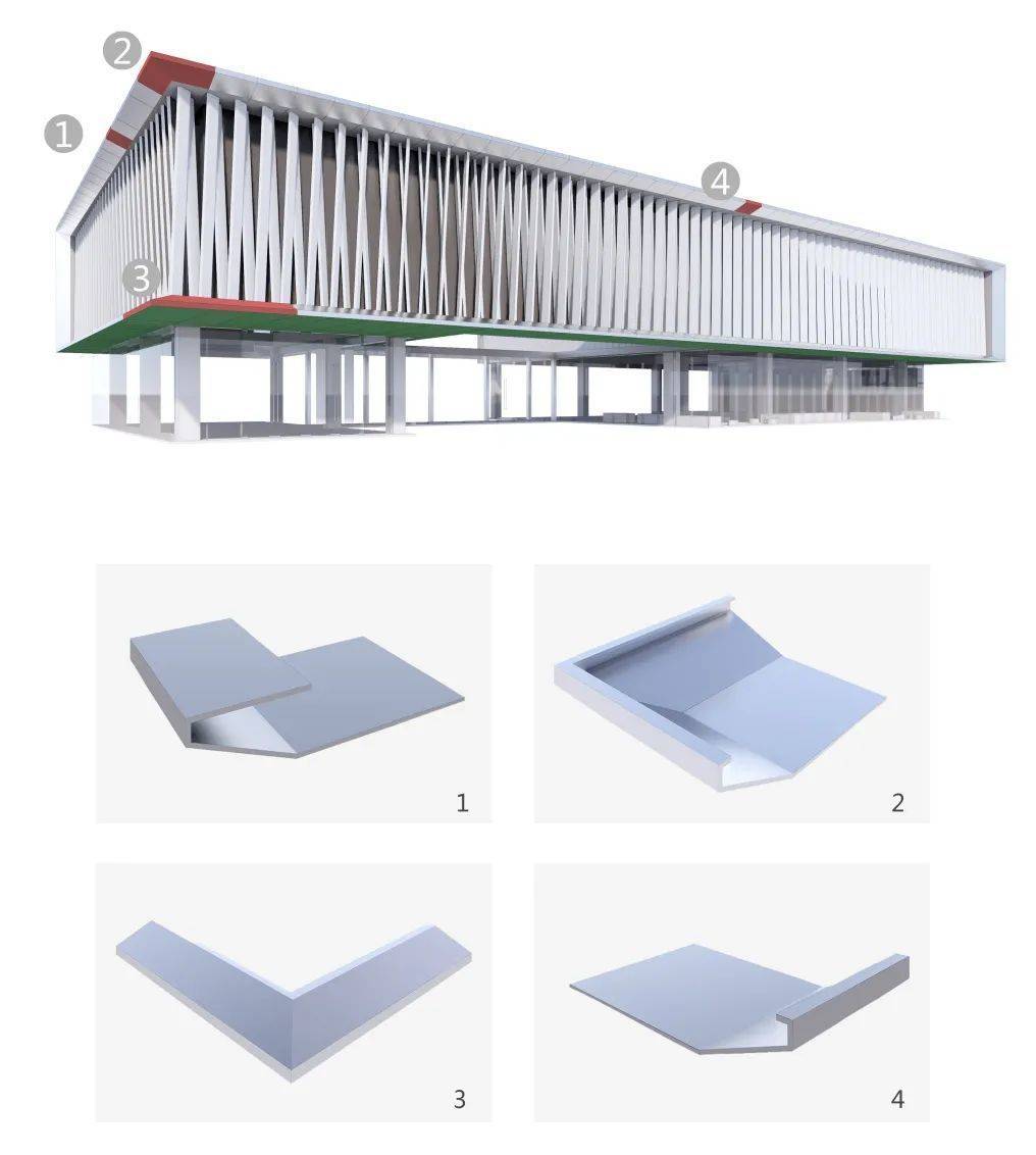 在形体转折位置采用铝板整体成形的处理方式,在工厂订制成形铝板,现场安装。这样减少了铝板胶缝对形体的影响,使建筑完成度更高,更加精致。