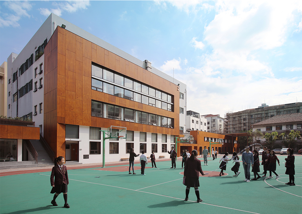 The original school buildings are mainly painted in different periods, which shows the typical light color method commonly used in the late last century. In order to minimize changes, we mainly improve the quality of the whole campus through dark wood color volume processing and detailed nodes. The wooden skin extends from the entrance along the teaching building on one side, creating a progressive effect layer by layer, which is simple and lively, making the whole campus space integrated. Under the original trees, the transformed school buildings are full of vitality.