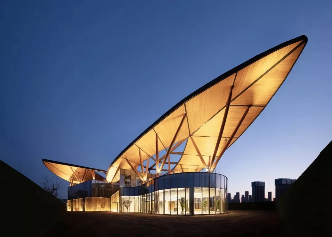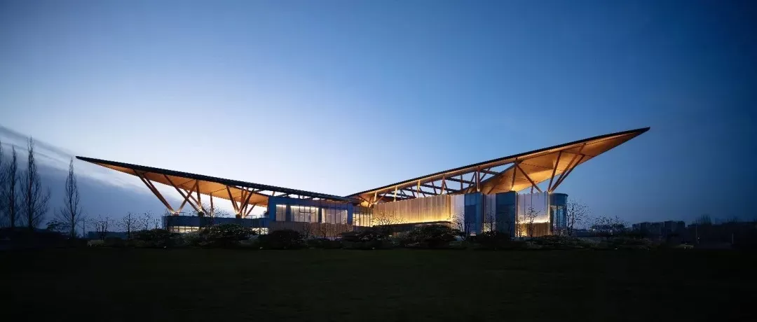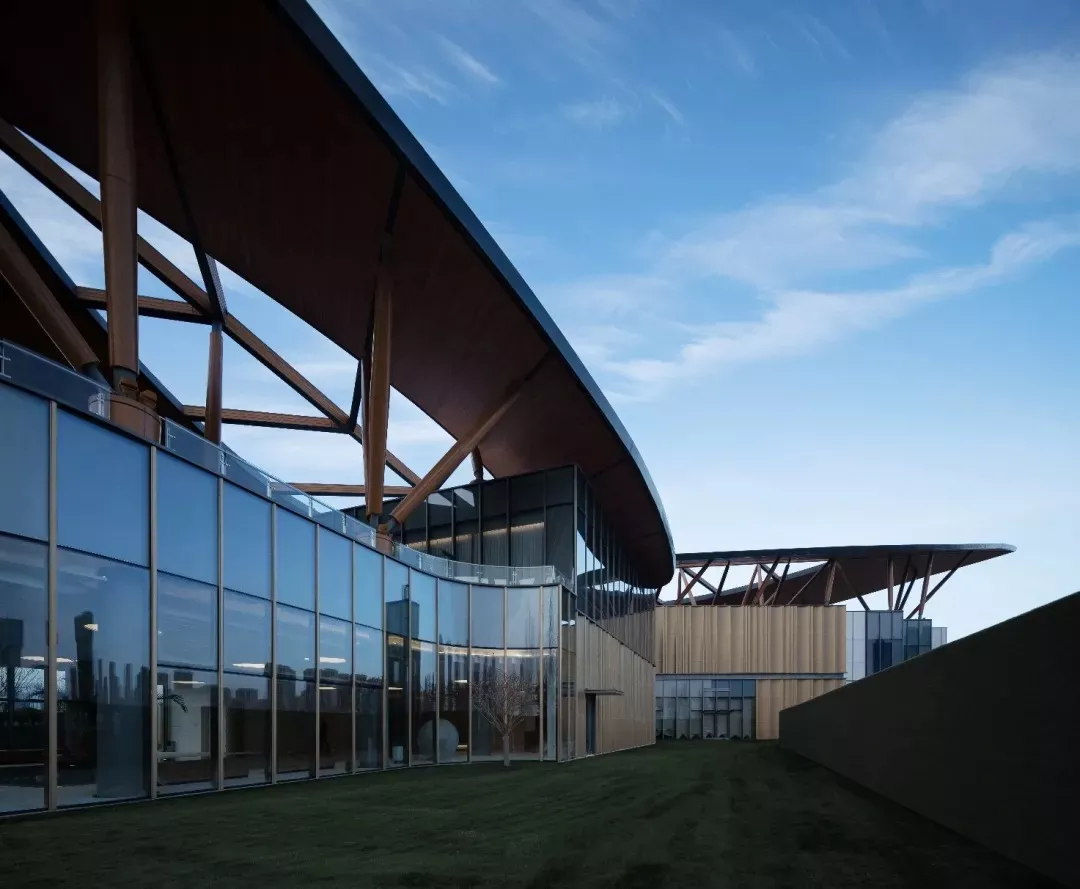 The main building and the auxiliary building use several groups of inclined and crossed shuttle shaped wooden columns to support two leaf shaped light roofs to form the fifth facade of the building. The middle of the leaves are hollowed out to expose "leaf veins", creating a visual effect of looking up at the sky from the woods and reducing the weight of the roof. We hope that through this design method, the building can be integrated into the natural environment as much as possible to express the overall image of leaves falling on the lake, leaving little ripples.