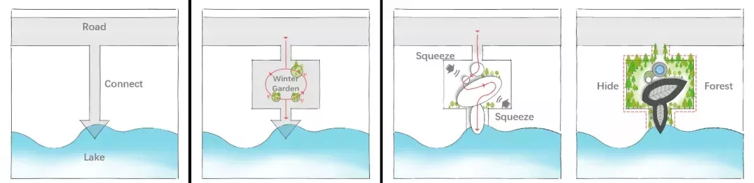 The planned building volume is 5000 square meters. In order to alleviate the pressure on the surrounding houses in the future, we take the two leaves falling on the lake and break the volume into three parts - the entrance, the main building and the auxiliary building. Through such techniques as block twisting and spatial staggering, a rich and interesting streamline and dynamic spatial experience are formed.