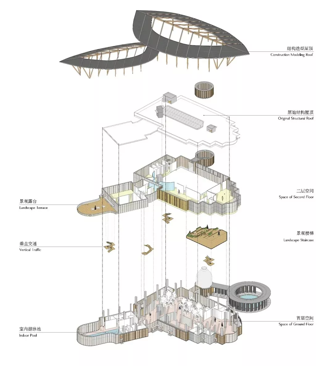 开放主题书吧作为垂直交通空间的主体,让业态有更好的展示性,同时也加大了中庭的面积,在屋顶采光天窗引入的自然光中得到更为舒适的室内交流活动环境。副楼直接与湖面相接,一楼设置观湖泳池,通过高差处理提提供一个侧壁采光的游泳环境,主副楼之间通过挑空的玻璃庭院连接,引导人流通过内设的景观楼梯进入二层的健身房区域和观赏湖区视野最佳的星空露台。