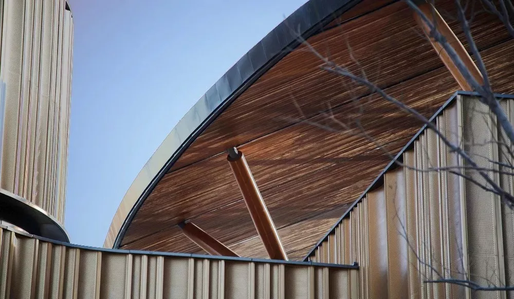 建筑的材料及色彩涉及广泛的感官体验,并且具有互补的特征,令人眼前一亮。建筑采用大面积弧形穿孔铝板幕墙和玻璃幕墙,削弱外立面的厚重感,软化建筑与环境的界限;白天阳光通过孔洞落在室内,呈现密林中穿行的斑驳光影效果,让人仿佛步入城市森林,呼应建筑主题;夜间灯光外泄,在树林中若隐若现,打造湖边树丛中萤火飘摇的浪漫场景。玻璃幕墙部分最大限度保持室内外空间的彼此渗透。