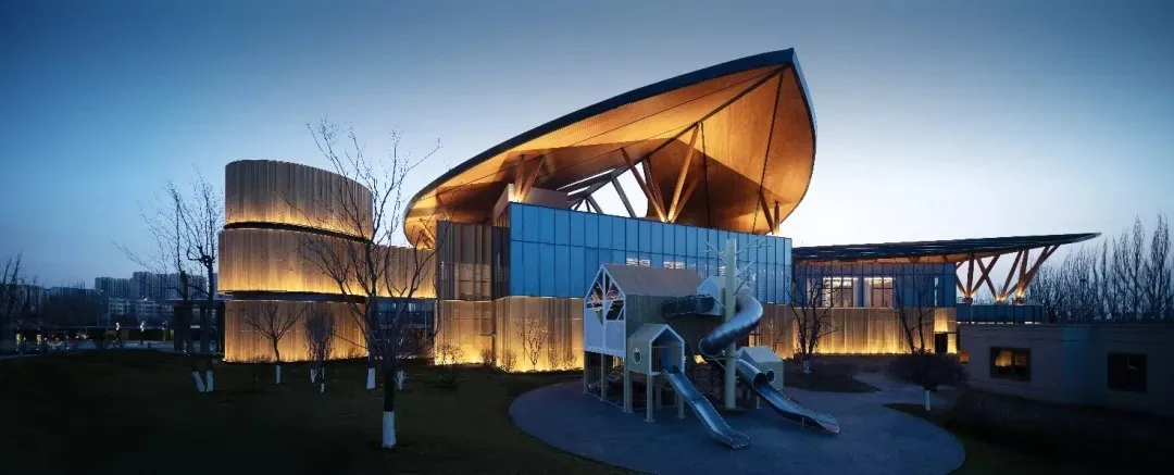 The materials and colors of the building involve a wide range of sensory experiences, and have complementary characteristics, which are eye-catching. The building adopts large-area arc perforated aluminum plate curtain wall and glass curtain wall to weaken the massiness of the facade and soften the boundary between the building and the environment; During the day, the sunlight falls into the room through the hole, presenting the mottled light and shadow effect of walking through the dense forest, which makes people seem to step into the urban forest and echo the architectural theme; At night, the light leaked out and loomed in the woods, creating a romantic scene of fireflies fluttering in the trees by the lake. The glass curtain wall shall maximize the penetration of indoor and outdoor spaces.