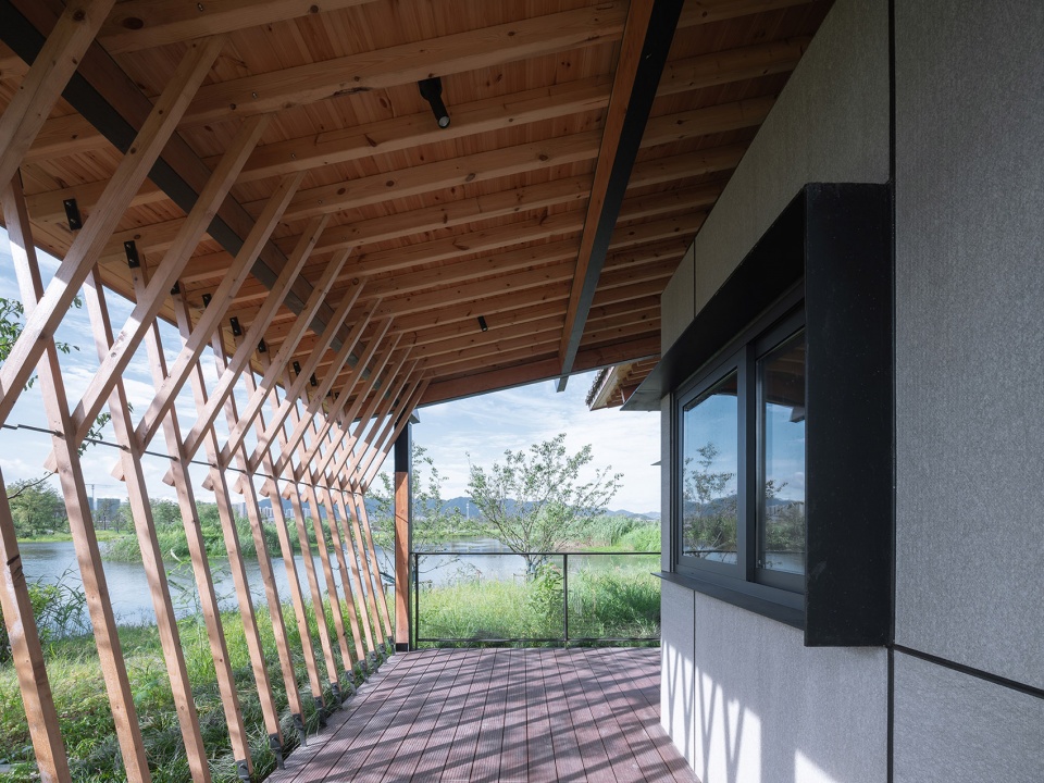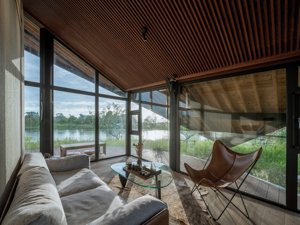 In terms of facades, the living room is equipped with a corner floor-to-ceiling window that can be completely opened. If all the windows are opened, the house would provide a complete view of the lake, aquatic plants and the terrace. The room can be comfortable when the opened entrance door makes the wind passing through. The bedroom is set up two-step-high from the ground, with an interesting triangular window on the rood, through which the wooden structure above and the sky can be seen. The toilet is connected to the bedroom on the back, in which a large bathtub is set in front of floor-to-ceiling doors and windows that can be fully opened. Guest would feel like enjoying a bath outdoors. There is a terrace outside the bathroom for resting after the bath.