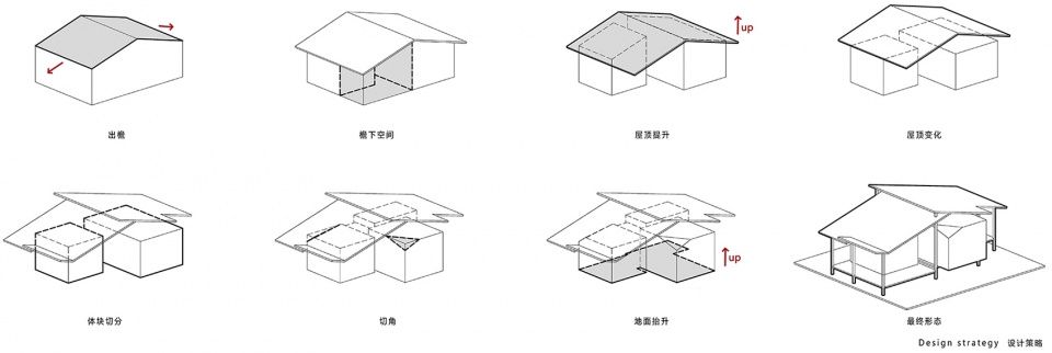 另外一个户型的设计概念则是在一个大屋顶框架里置入三个小盒子,每个盒子的大小高度不同,对应着不同的功能,盒子与屋顶脱开,只是放置在构架上,看起来很轻盈,同时空气可以从屋顶下穿过,双层的屋顶也有效的避免了夏天室内温度过高,起到很好的节约能耗的作用,两个露台连接了盒子体量和构架,形成一个完整的使用空间,客房将近一半是半室外的空间,强调了在自然环境中半室外体验的重要性。