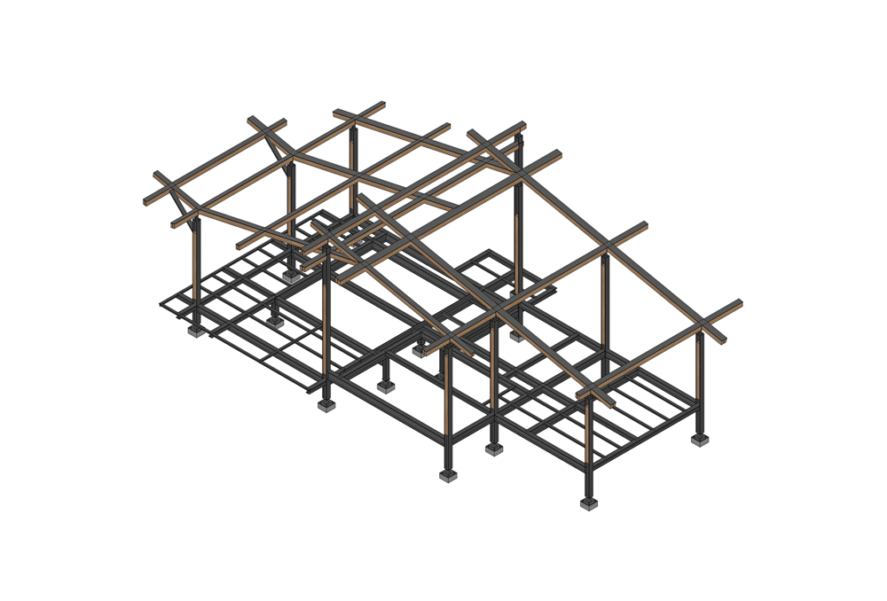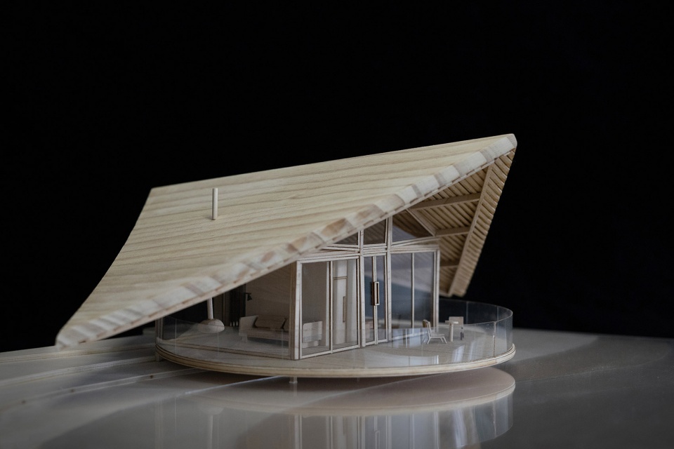 而大户型则是将屋盖框架体系和室内盒子体量的结构完全分开,屋盖系统的结构全部裸露清晰可见,包括钢木连接构件,工字钢填充木头,木头构件之间的连接,还有底部架空的钢结构杆件,而盒子体量的内结构则是被包裹起来,让建筑的空间形成逻辑很清晰的表达,也让建筑的建构之美通过精小的建筑展现出来。