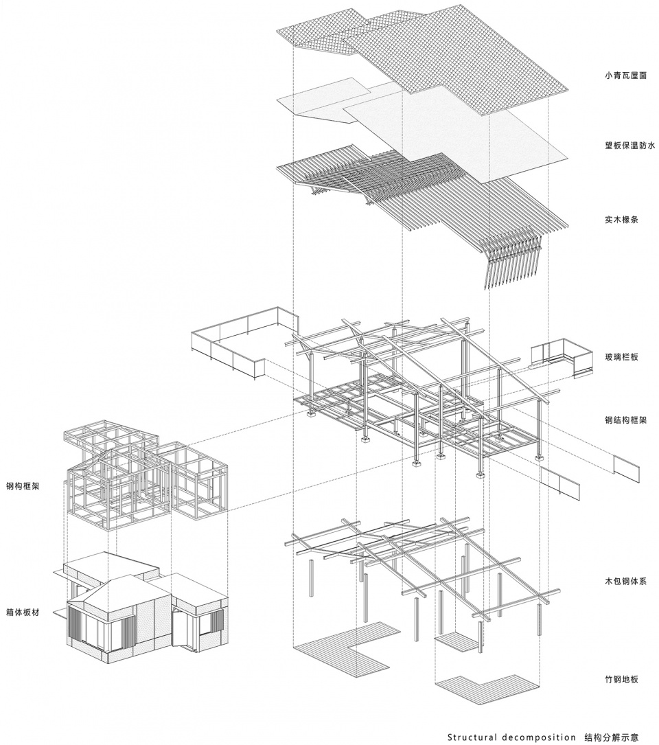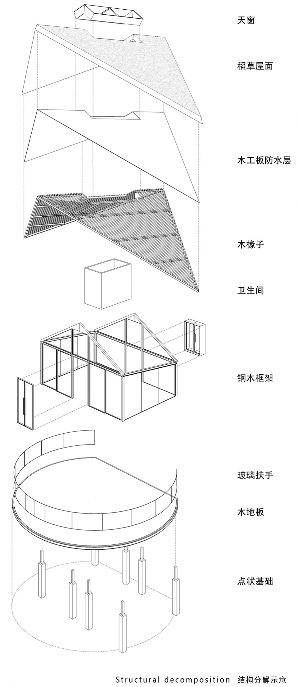 Materials: Pine, Thatch, Green tile, Cement board, Bamboo floor, Light steel wall