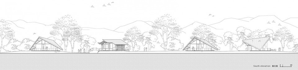 Besides, the Jiangnan style is also expressed by connecting the formation of the houses with the hills surrounding the wetland. The slope of the house’s folded roof is kept similar to the contour of the mountain so that the houses and distant mountains can be seen through the nearby reeds. From this angle, the houses seem to echo the mountain, greeting each other and responding to each other from a distance.