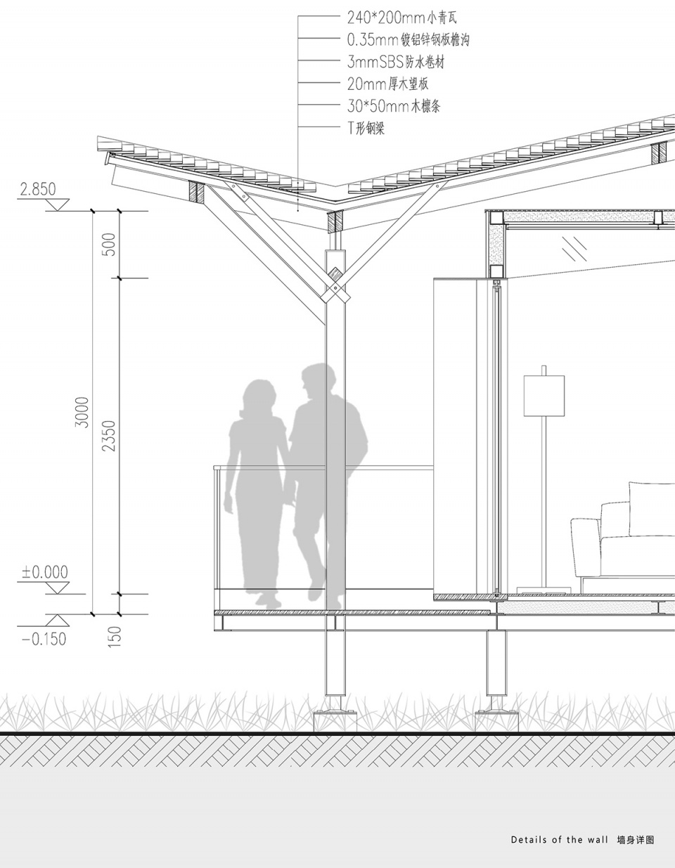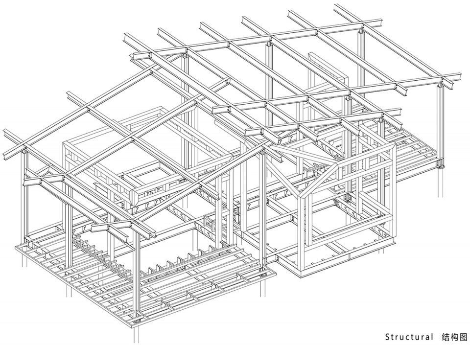 The steel structures are used in different ways in the two houses. In the smaller type, steel structures and spatial facade are exposed in an obviously way, while the glass door and window fill in the middle of the structure, forming an integral relationship.
