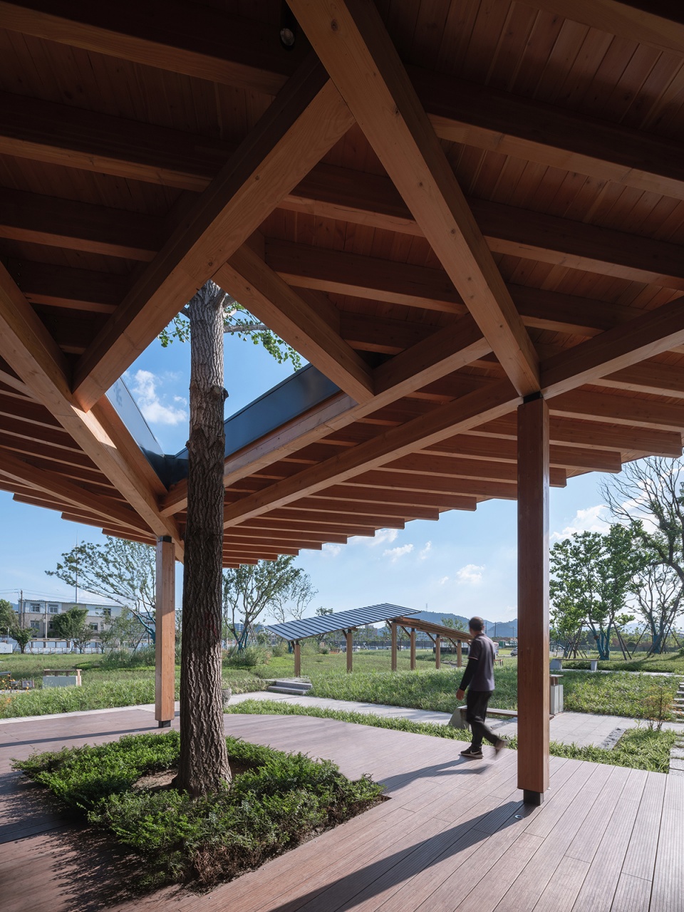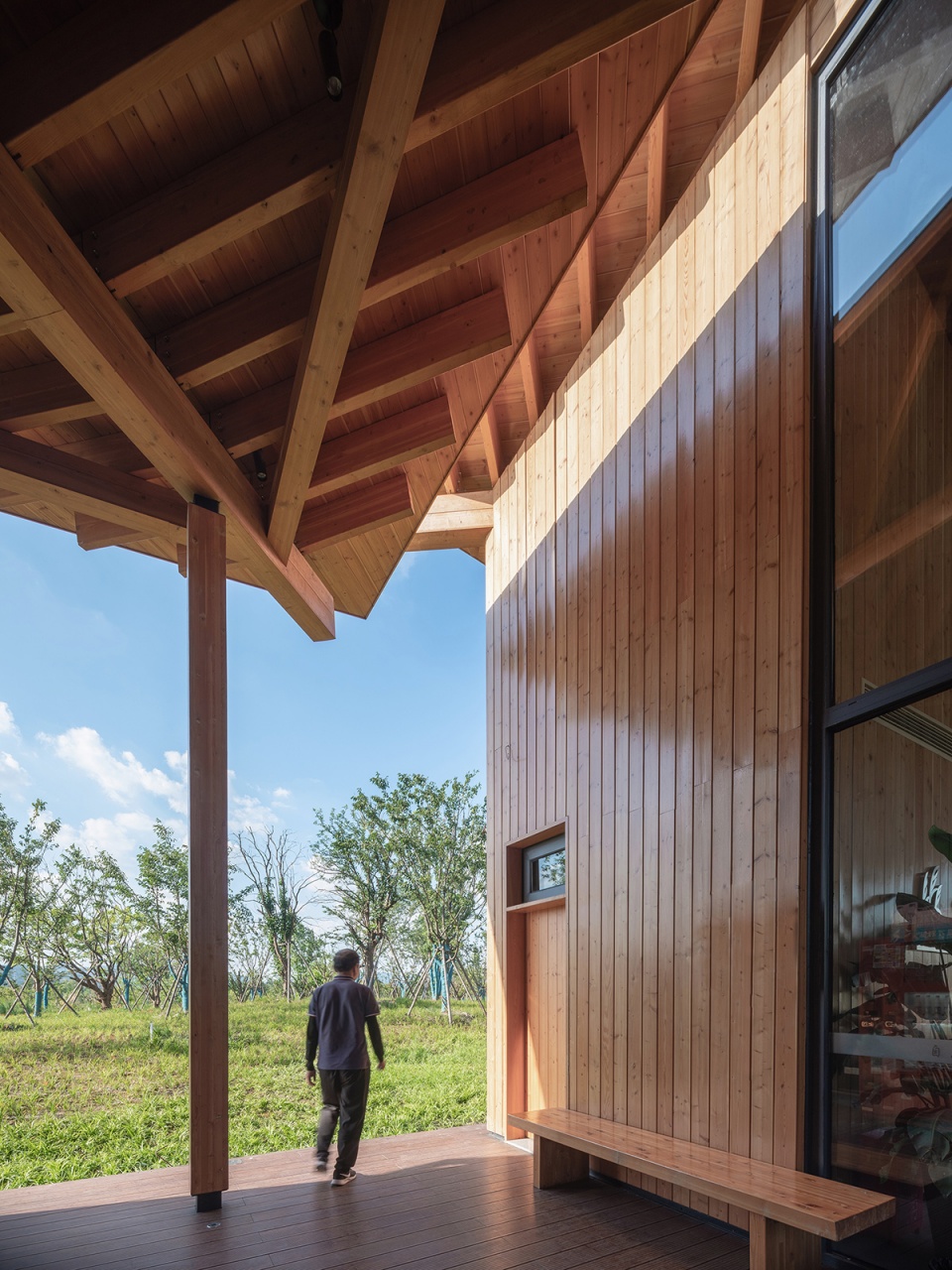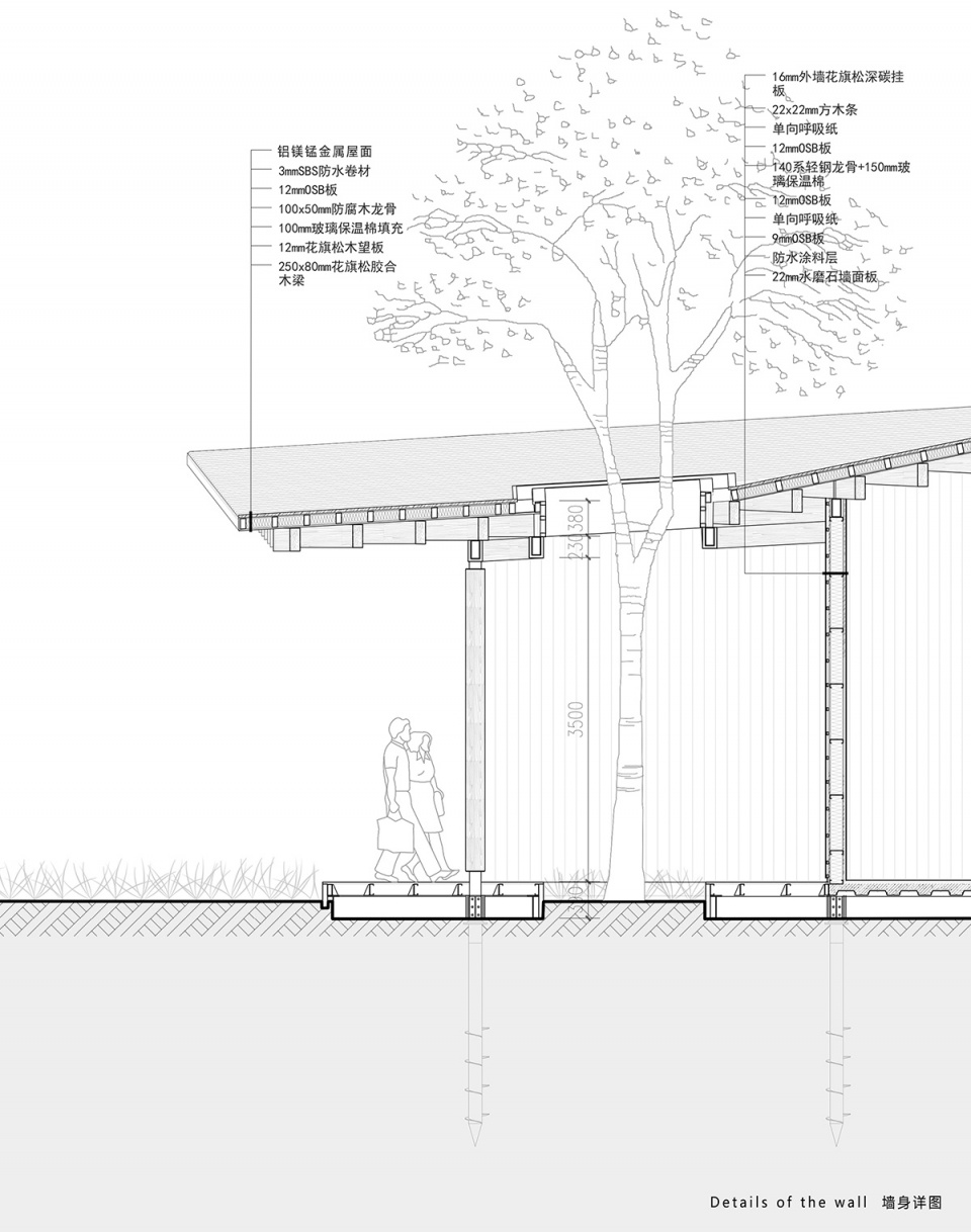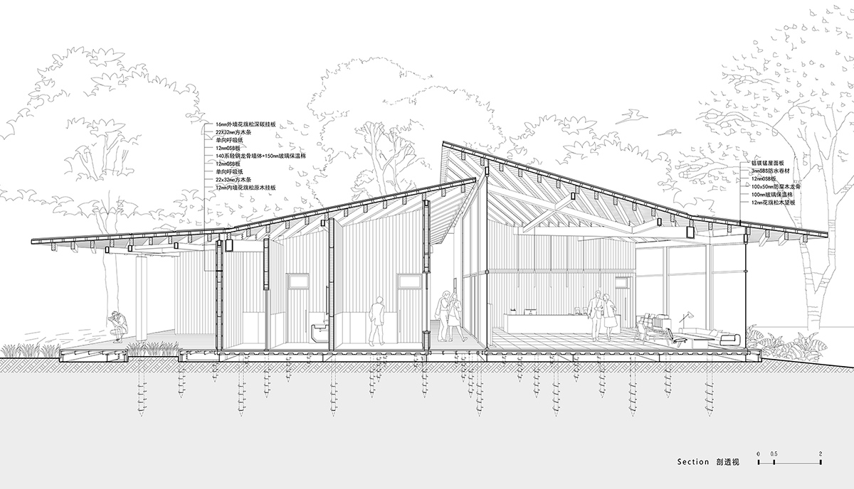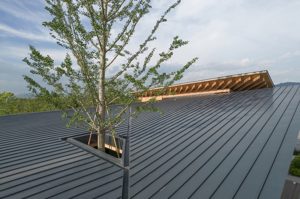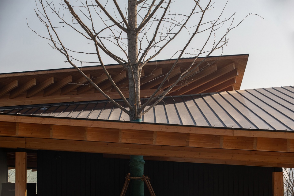 最后是对传统建筑智慧的提取,与中国的传统木构建筑的呼应不仅仅是在形式上,也在于建造的内部逻辑上。中国传统木构建筑的精髓就在于的装配式概念,所有独立的构件都用隼卯的方式连接,可拆装重组,可更换翻新,可修复迁移,属于最纯粹的最早的最灵活的装配式建筑,包括木构建筑外围砖瓦材料,同样都是可以非常轻便的单元式构件材料,可以被组织被重构被二次利用。建筑与大地的连接方式也是轻巧的,直接是放置在大地上,房子被拆除之后,原来的宅基地就可以直接变成自然地,耕种作物,这都是中国传统文化中最高级的智慧。