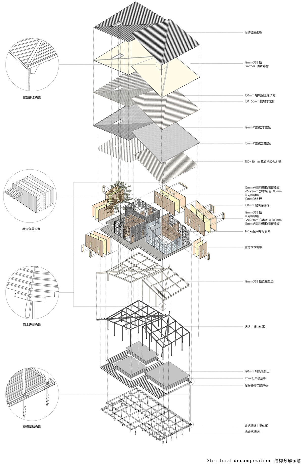 Construction Materials: Douglas fir Laminated Timber, Burned fir, Al-Mg-Mn Alloy Sheeting, Bamboo and Wood Floor, Light Steel Wall, Terrazzo