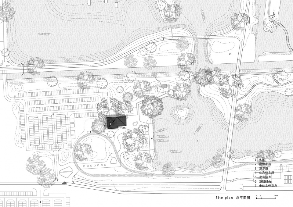 The reception center is located near the south parking lot of the wetland park, at the side close to the downtown area of Fuyang District. With its close proximity to the city’s center of human and potentially tourist traffic, the reception center is expected to fulfill the demanding role of visitor accommodation. The relatively compact building needs to provide a variety of functions, including visitor reception, information booth, ticketing, management, office space, and medical services. Visitor amenities like restrooms, nursing rooms, vending facilities, and resting areas are also expected to be incorporated by the design. Once constructed, together with the nearby sight-seen train station and pedal boat dock, the building will serve as a vital tourist traffic node for Yangbei lake wetland park, facilitating visitors’ needs.