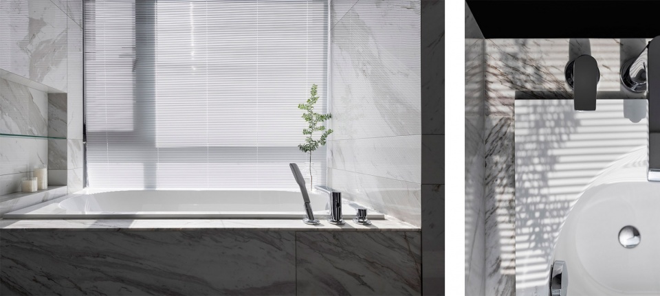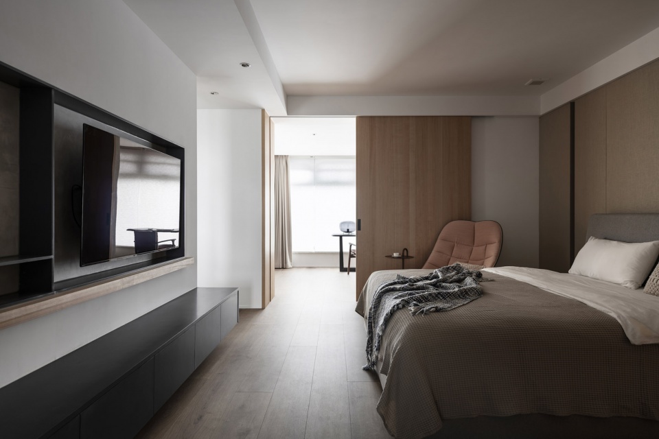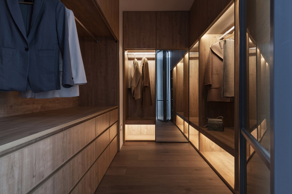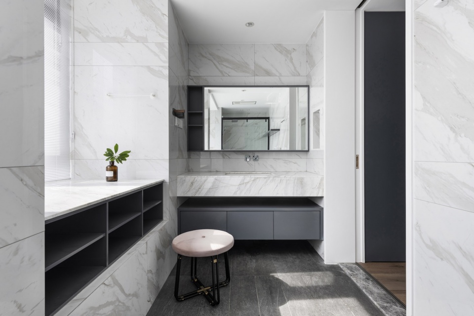 The master bedroom adopts an open “suite” design concept, which combines functional areas such as cloakroom, dressing table, study room, bathroom, etc., to form a complete suite space.