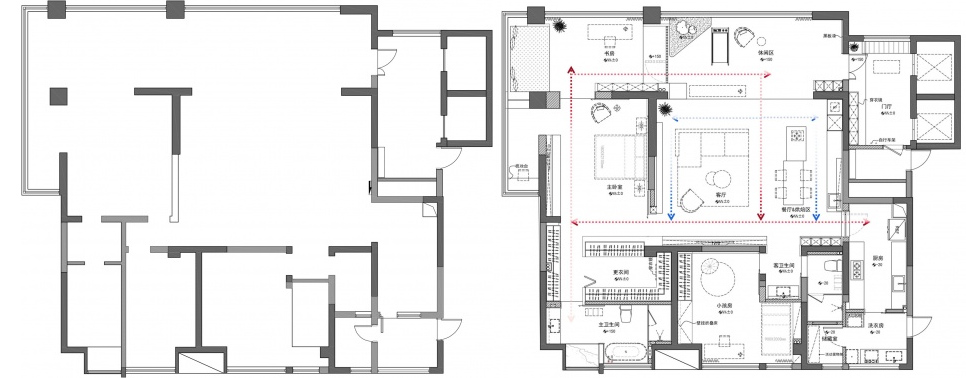 房间总面积220㎡,在做空间设计的思考时,根据夫妇俩的生活需求,打造更多开放式场所,借由功能串联出各空间之间“回字形”动线,满足空间灵动性,使之具有行走的自由体验感。夫妇俩喜欢聚会,分享美食,客厅/烘焙区/休闲区组成开阔明亮的公共区域,让每个人在做自己事的同时,充分实现互动性。