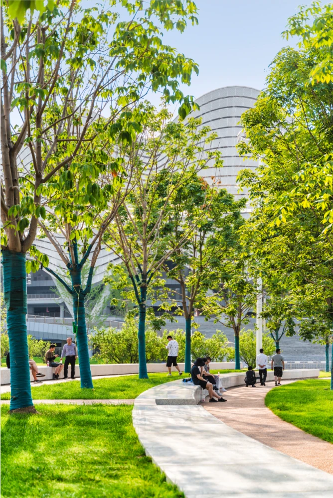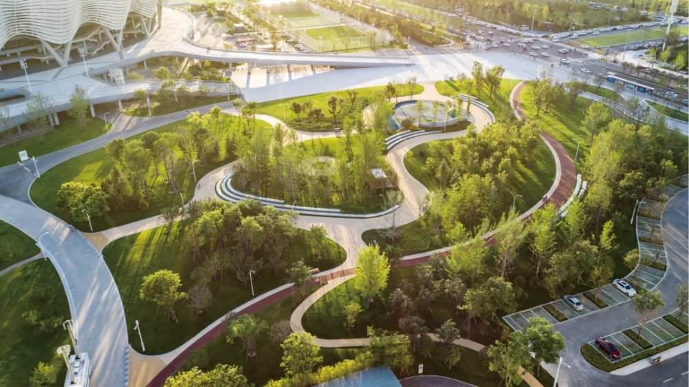 西安奥体中心园区承载了运动、休闲、生态等多重属性。景观在这里不仅服务于赛事本身,也兼顾了场地的市民性与公共性,营造了一个复合的、弹性化的公共空间。场地秉承“森林公园”的整体基调,林荫覆盖、地形起伏、四时皆景,供市民活动休憩。