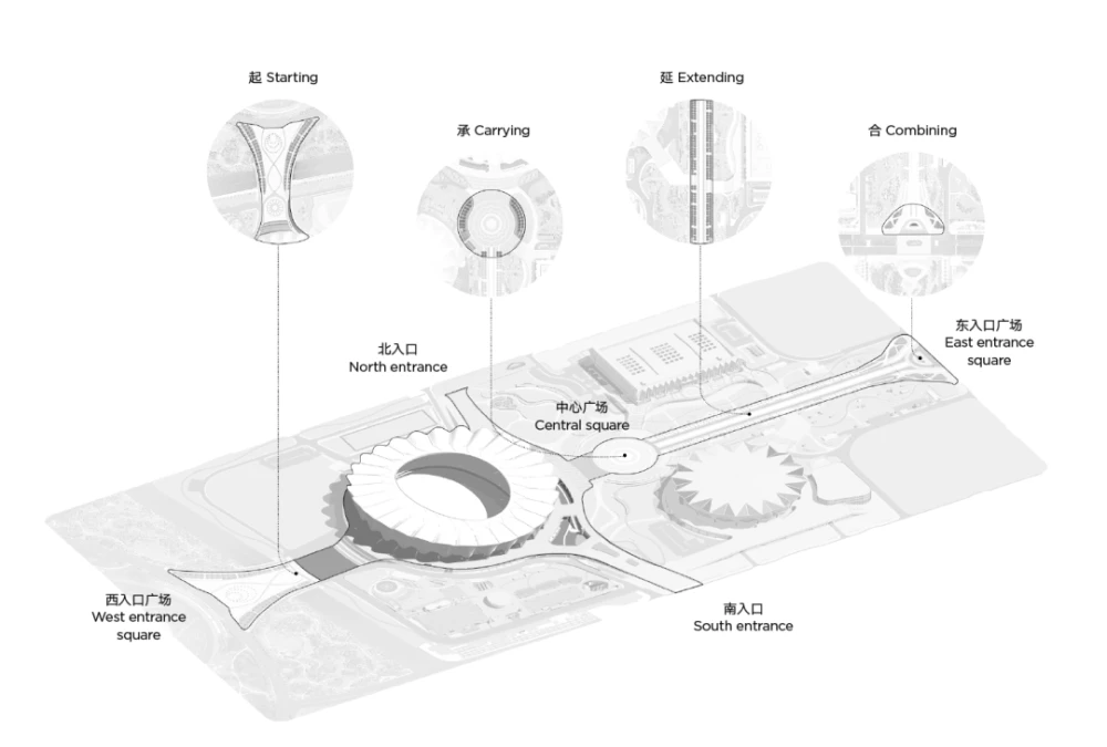 ▼奥体中心主轴空间序列:起、承、延、合,Main axis space sequence of Olympic Sports Center: lifting, bearing, extension and closing