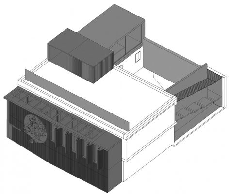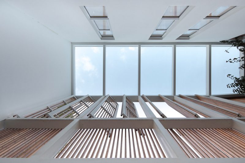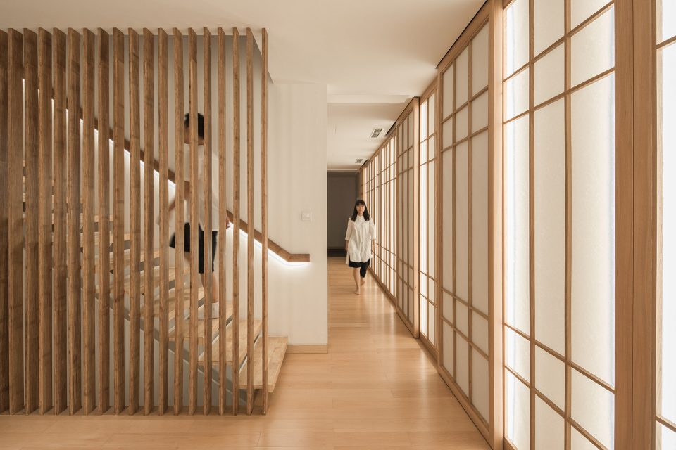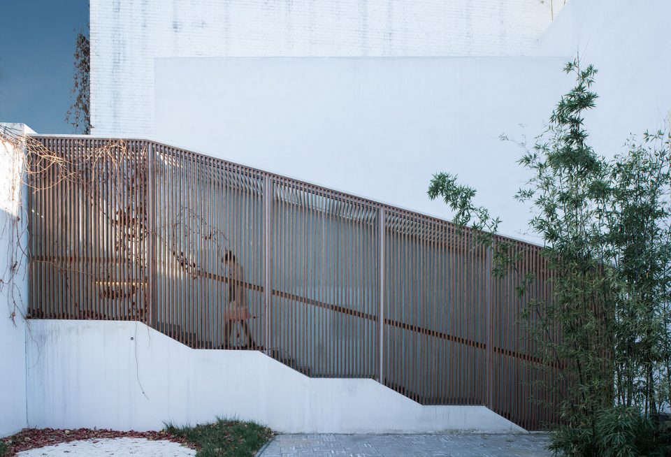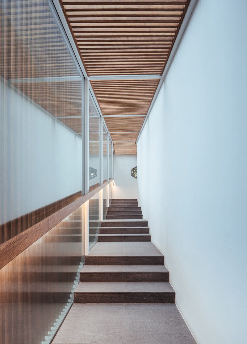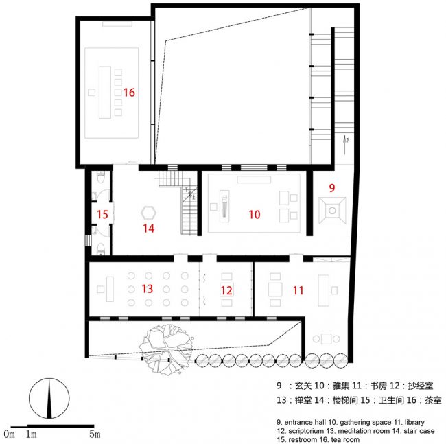 They will enter the backyard after turning to the north and walking through the entire Zen Chamber. Architect added a folded stairs in this area, located between the long ramp and paralleled stairs. People will see the inner courtyard and a big tearoom through the grating racks while stepping up the stairs. Then they can reach to the second floor through a long, narrow, and closed space. The second floor is served as the main public space of the building, including a Guqin (a representative instrument of traditional Chinese musical culture) room, small tearooms, meditation room and a large tearoom.