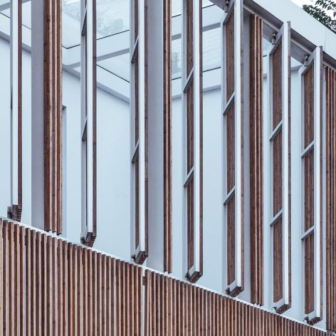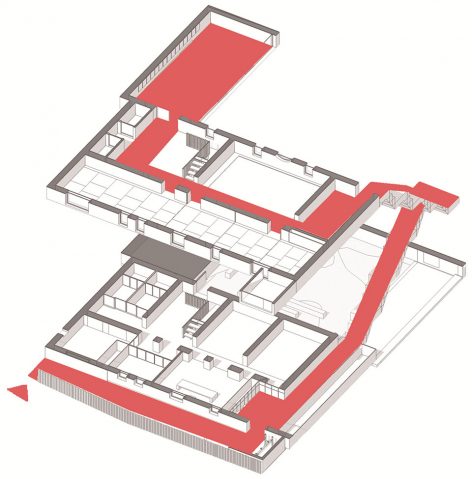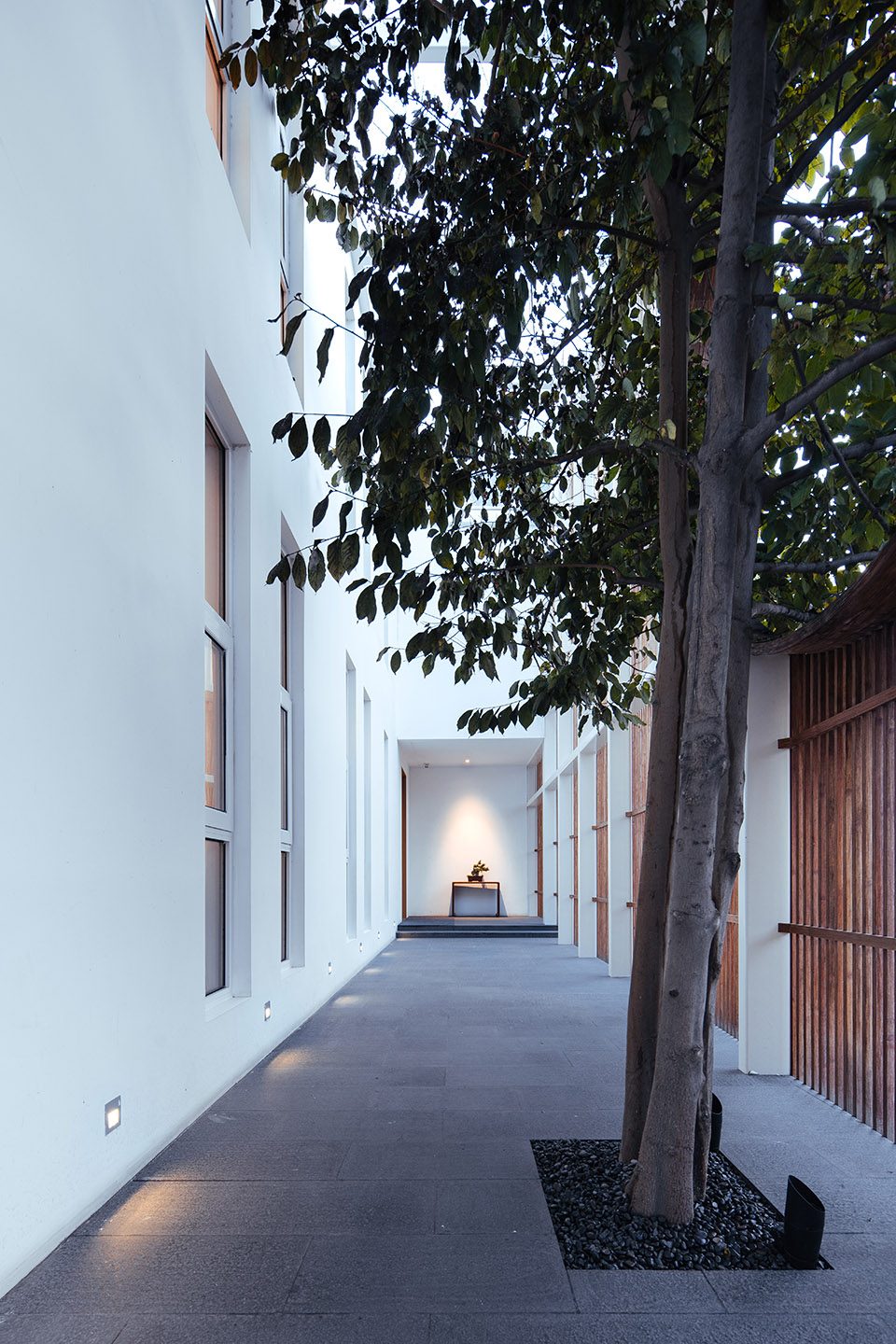 ▼半室外廊道拉长人进入建筑的时间,a long and narrow semi-outdoor corridor creates a longer circulation for people to calm down