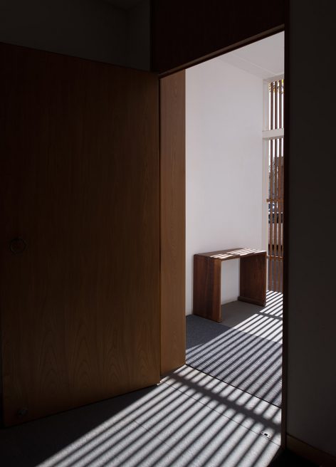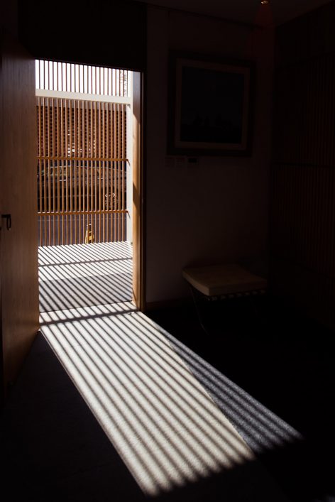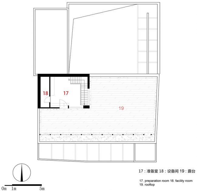 然后转头向北穿过整个建筑进入后院空间;在这里建筑师加建了一个对折的楼梯空间,它的形制介于长坡道和两跑楼梯之间;人们拾阶而上,途中会透过格栅看到内院和对面的大茶室,然后转头进入一个狭长、封闭的空间;最终进入二楼。这里才是这个建筑主要的公共空间,包括雅集空间(琴室)、小茶室、禅堂和大茶室。