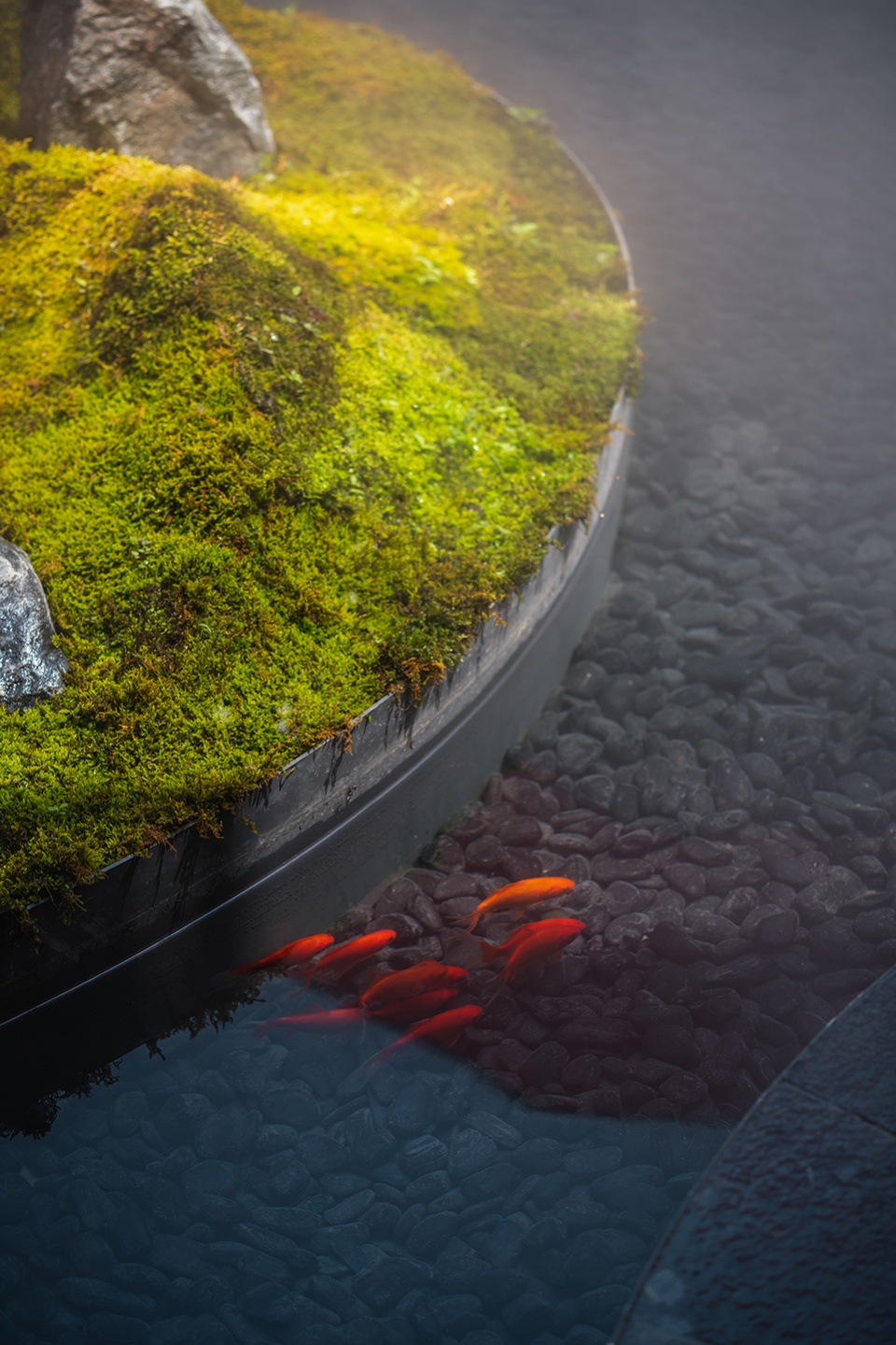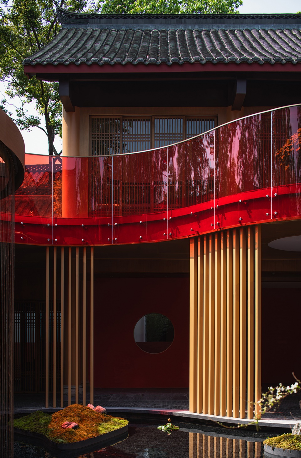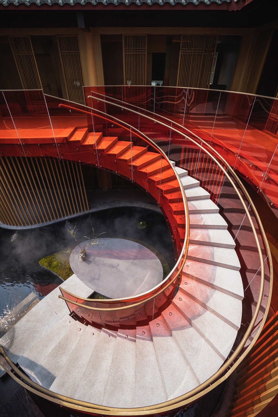 One of the fundamental Daoism philosophies is to follow the non-willful action, in which any human tampering with the flow of reality will be reverted to what is natural. MUDA starts with the idea and restored the original rigid square-shaped courtyard with a soft yet bold skyline. By adding the second-floor terrace and connecting the terrace with the sinuous spiral staircase, the visitor’s sight is framed by the smoothly designed red glass fences. Following the classic Chinese garden feature of ‘three Islands in one pond’, we designed a water-featured landscape, restoring the courtyard to its natural state.