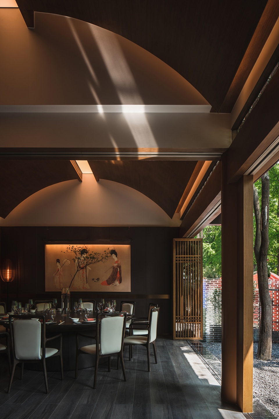 MUDA慕达建筑希望花园包间的设计,可以与得天独厚的自然环境建立互动。包间外即是青羊宫的古塔,几百年树龄的银杏贯穿其中。空间色调以木色和白色为主,使用灵活的木格栅推拉门实现空间的通透性,内外空间相互渗透,与青羊宫景色相映成趣。