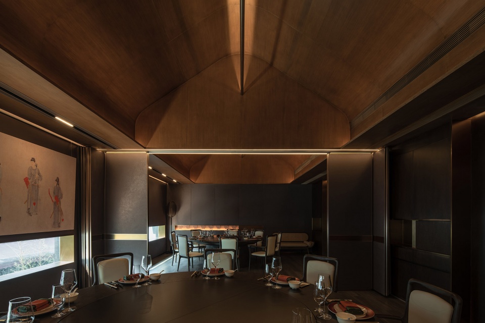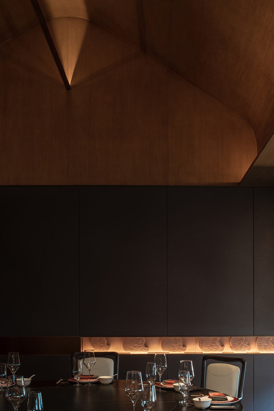 项目中一层和二层均有连续包间,二层连续包间通过顶部坡屋顶元素塑造木纹弧顶。包间与包间通过可移动隔断来灵活划分使用,软装设计以简洁调性为主,确保空间的秩序感。木饰面与墙面深灰色软包,以及搭配的吊顶氛围灯带,使整个空间兼具合用的整体性和单独使用的独特性。