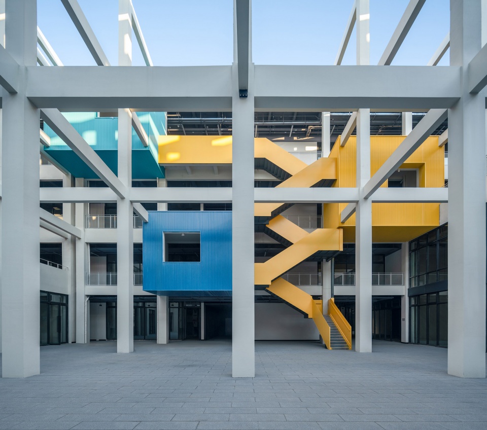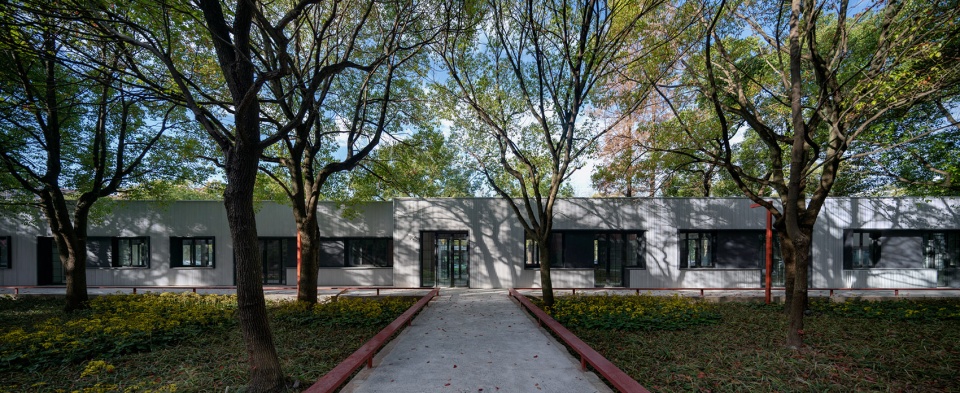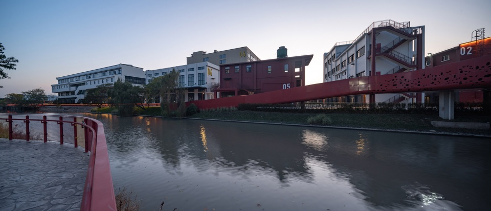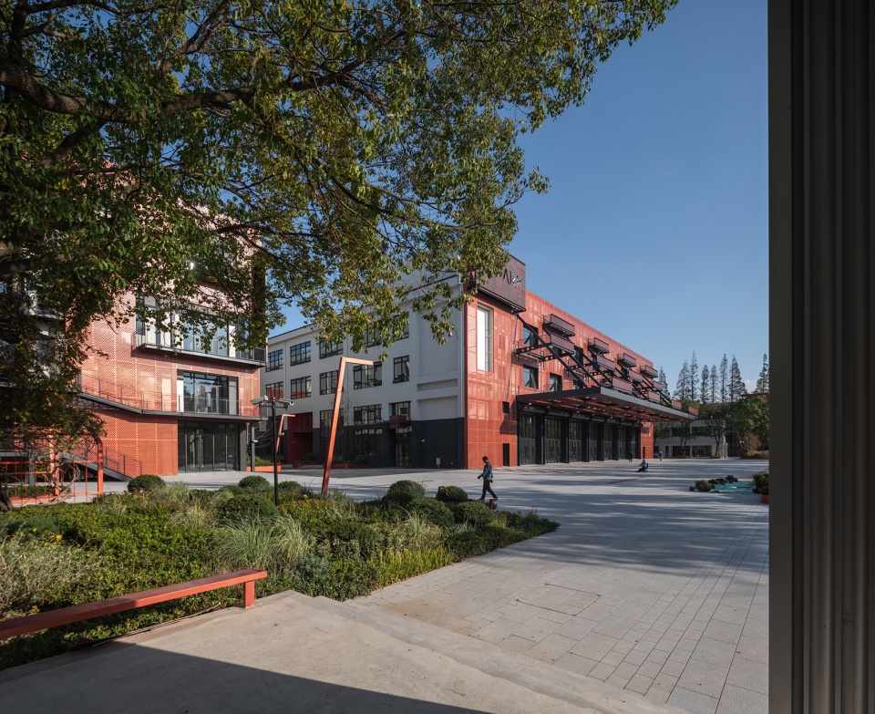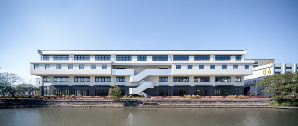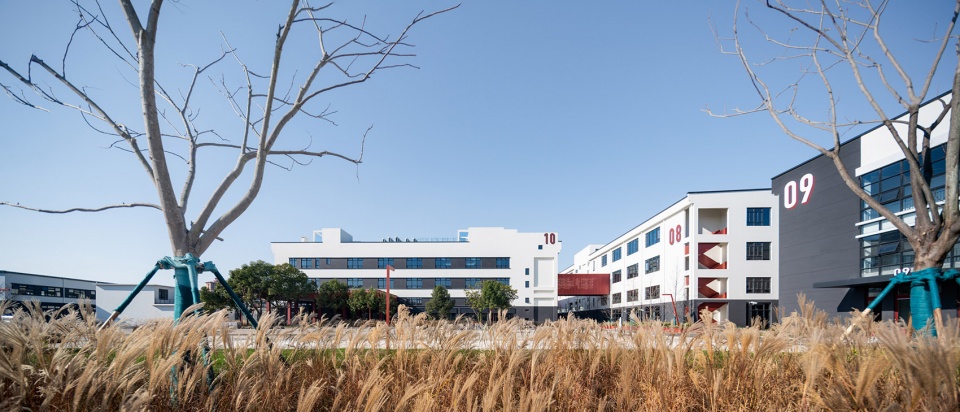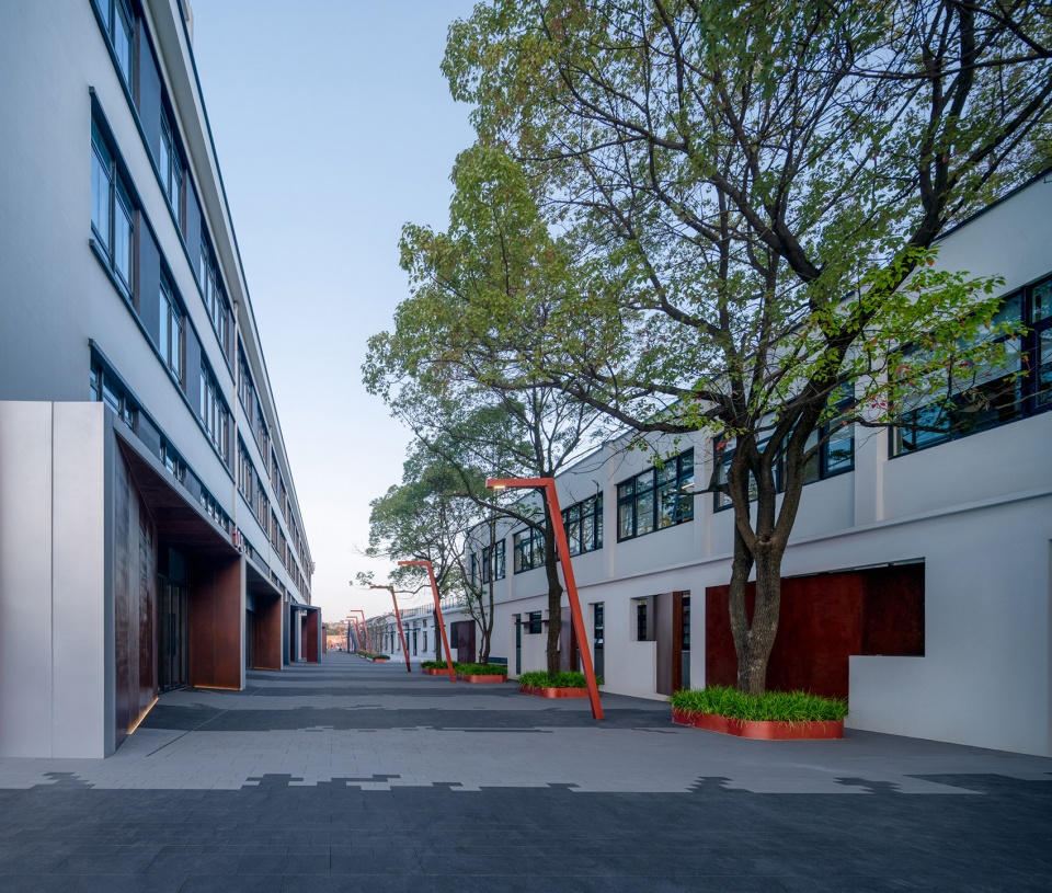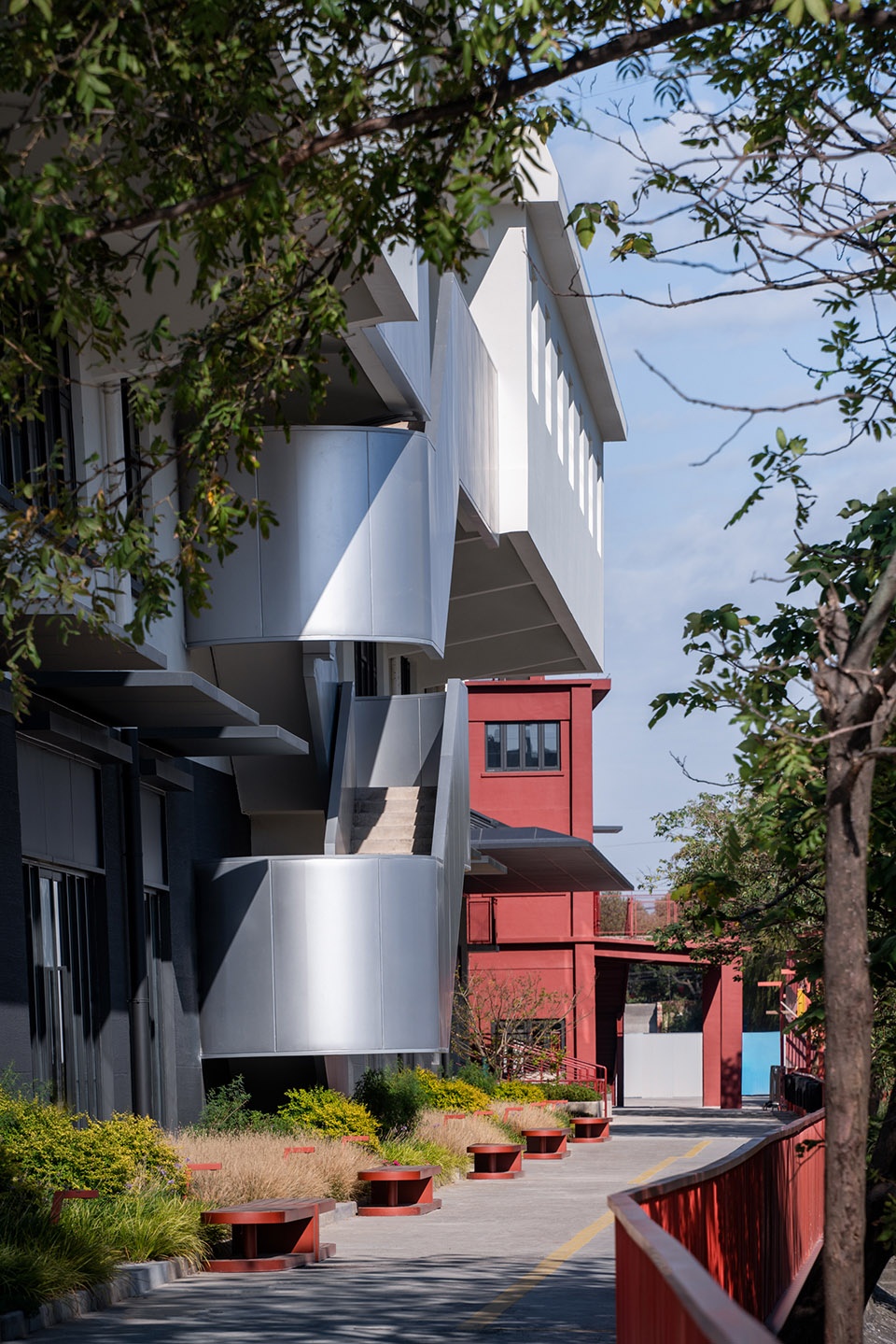 Except for the interface along the Humin Road, all other parts adopt the facade design of the black, white, gray + red, yellow and blue colors as the tone. The 18 large factory buildings have their own characteristics. Some form an integrated display interface through combination (#302, #305, #205, #206).Some independently form their own site language in the site areas (#105 roadshow space). Some are integrated with dawn redwood and other arbors, partly hidden and partly visible (#402a, #503, #201, #502 and life supporting area).Bauhaus is the tone of the design, whose specific details are created along with the characteristics and functions of the buildings.