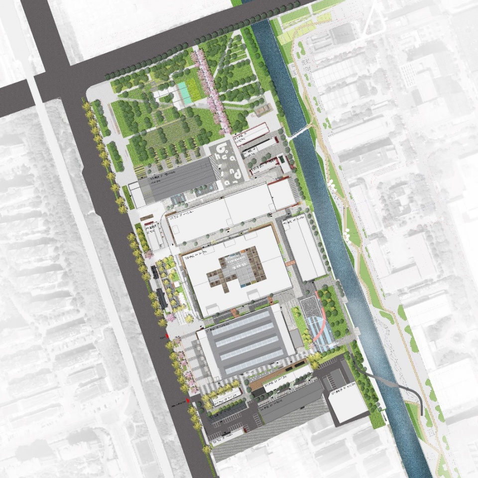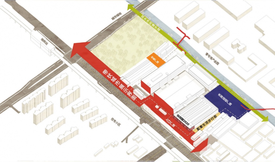 The rubber factory is a part of the old Minhang industrial base. With the development of urban construction today, the south Shanghai Binjiang industrial development cluster area has been formed in the periphery with Jiaotong University as the core. On the east side of the industrial park are the Jiaotong University Science Park and Zero Bay Industrial Park, whose rich industrial historical context and waterfront landscape resources provide the foundation and guarantee for the rich, diversified scene design and surrounding customer positioning of the park. On the west side, Humin Road and Hengjinggang River, in the north-south direction, form the two longest and most important interfaces of the base. As a trunk road connecting the old Minhang and the downtown area of Shanghai, Humin Road and the rail traffic constitute a busy personnel communication channel. While blocking connection in the east-west directions, Hengjing Port provides an opportunity to combine industrial functions and natural environment.