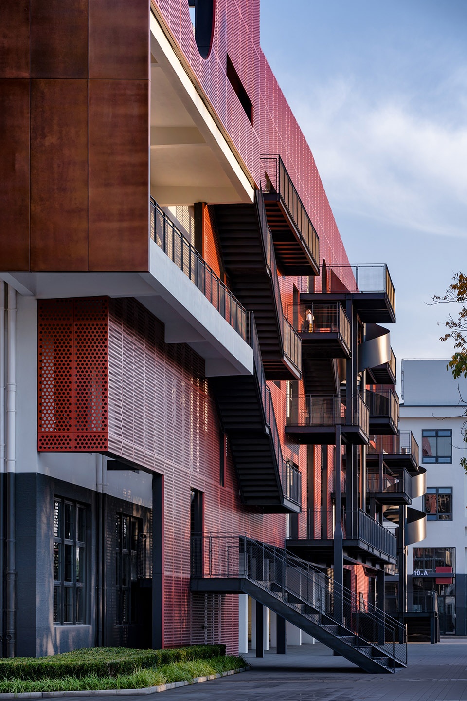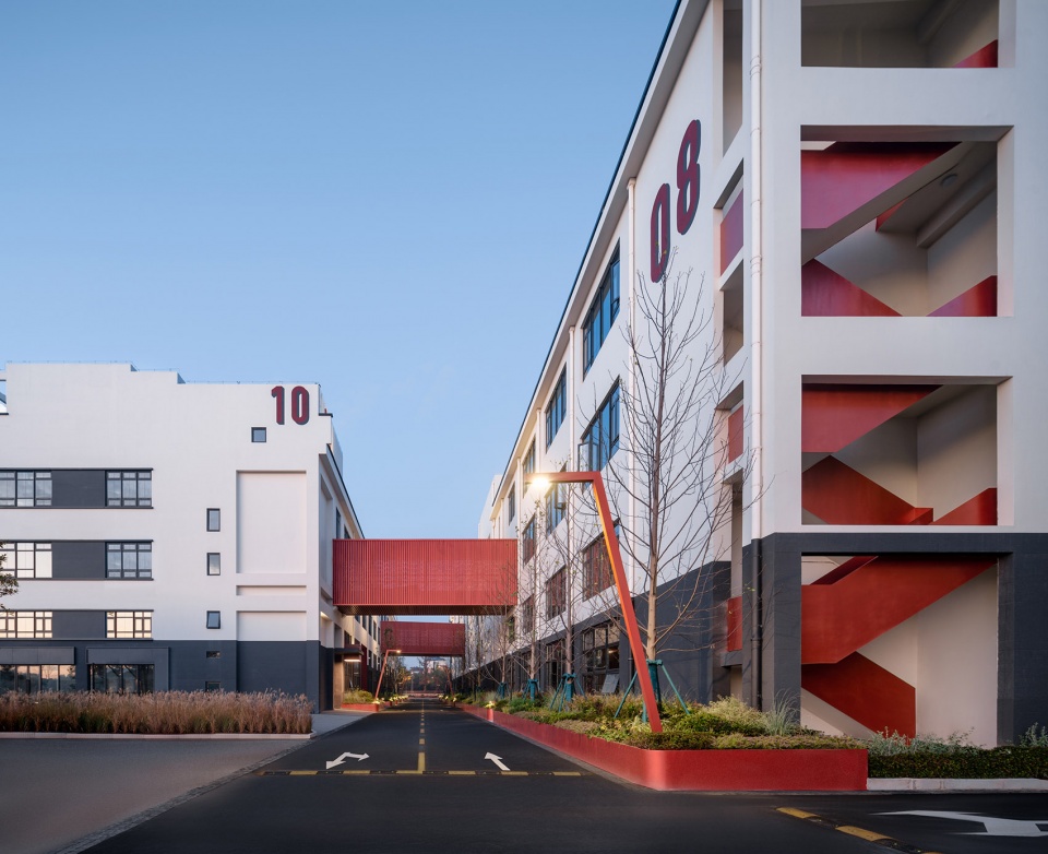 沪闵路的城市沿街界面作为园区对外展示的第一形象面,采用了强烈的构成手法来形成主要视觉形象,将沪闵路广场上的景观和路径倒映在厂房的立面之上,通过立面错落的平台与园区内部空间连通,在使用体验上增加了层次感和丰富性。园区沿街部分是大胆奔放的红,园区内部是冷静理智的白,一红一白,一深一浅,互相映照,互相衬托。