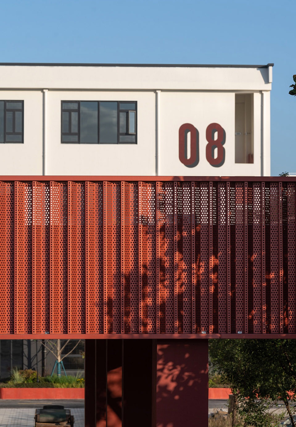 The interface along the Humin Road, as the first image of the park for external display, adopts the strong composition technique to form the main visual image, reflecting the landscape and path of Humin Road Square on the facade of the factory. It is connected with the internal space of the park through the strewn platform of the facade, adding to the sense of hierarchy and richness in the use experience. The part of the park along the street is decorated with the bold and unrestrained red, while the inside of the park adopts the calm and rational white. The red and white, in deep and light colors, shine upon and set off each other.