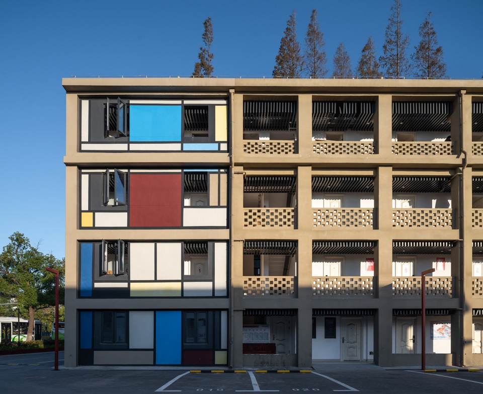 ▼黑白灰+红黄蓝为基调的立面设计,facade design based on black, white, grey + red, yellow and blue