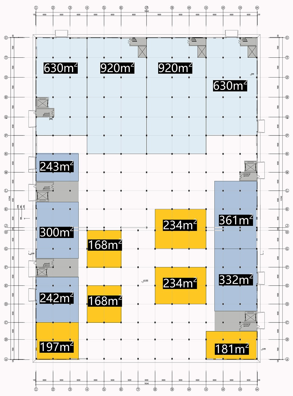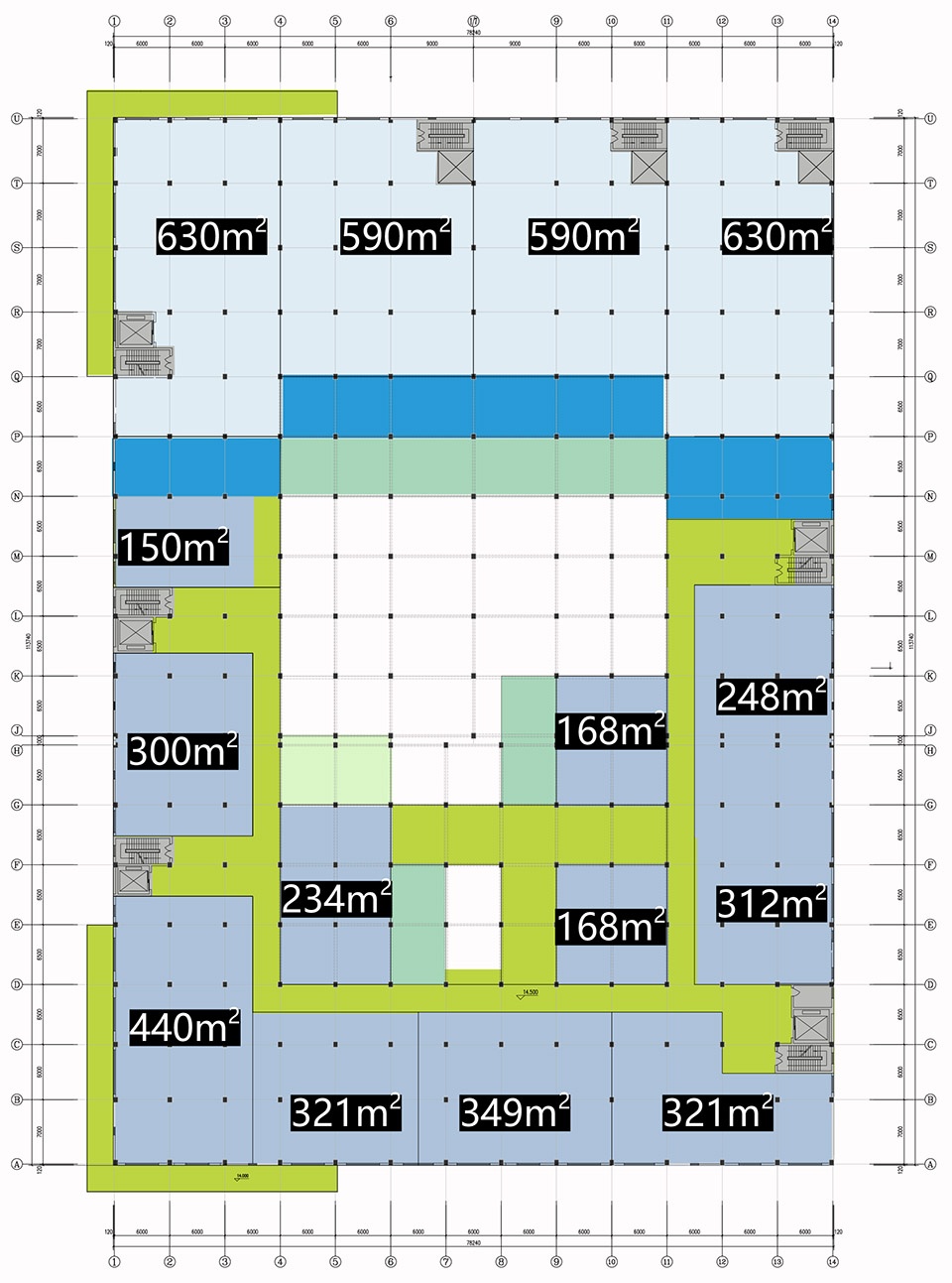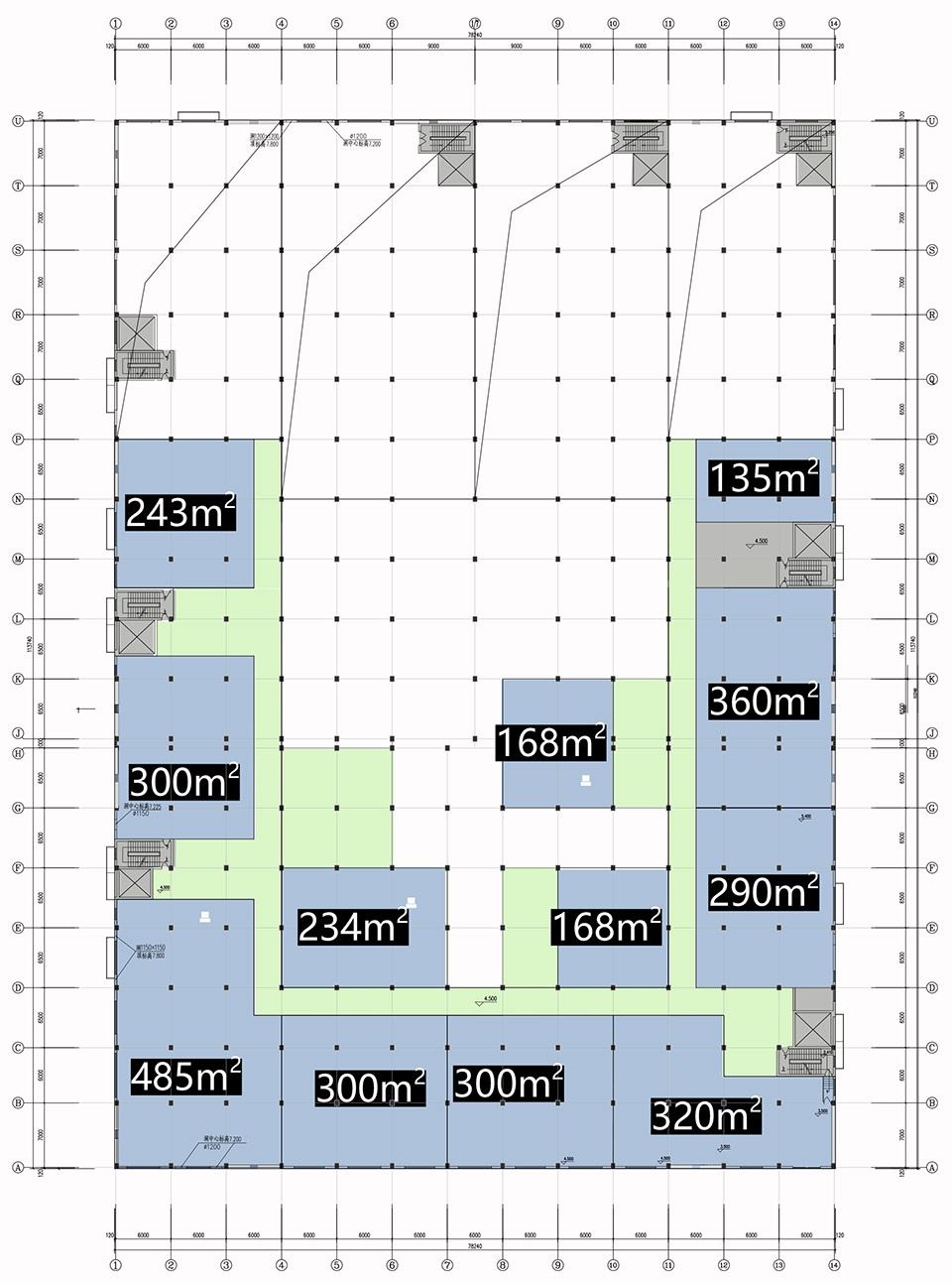 主入口的两栋楼102、103是园区最大的挑战,78MX110M的开间进深,2.6万方的巨大体量给了我们设计无限可能。我们在102的楼栋里面“开膛破肚”,延续外立面以体验为主的设计原则,创造了不同标高和体量的错层盒子,也规划了大小不同,面积可分可合的办公产品——包括小独栋,标准办公、跃层办公和商业盒子,体量之间的错落也无意识的形成了高低进深不同的露台。