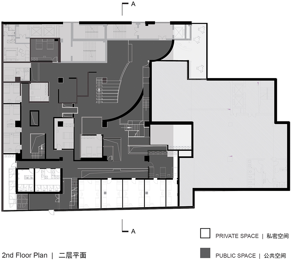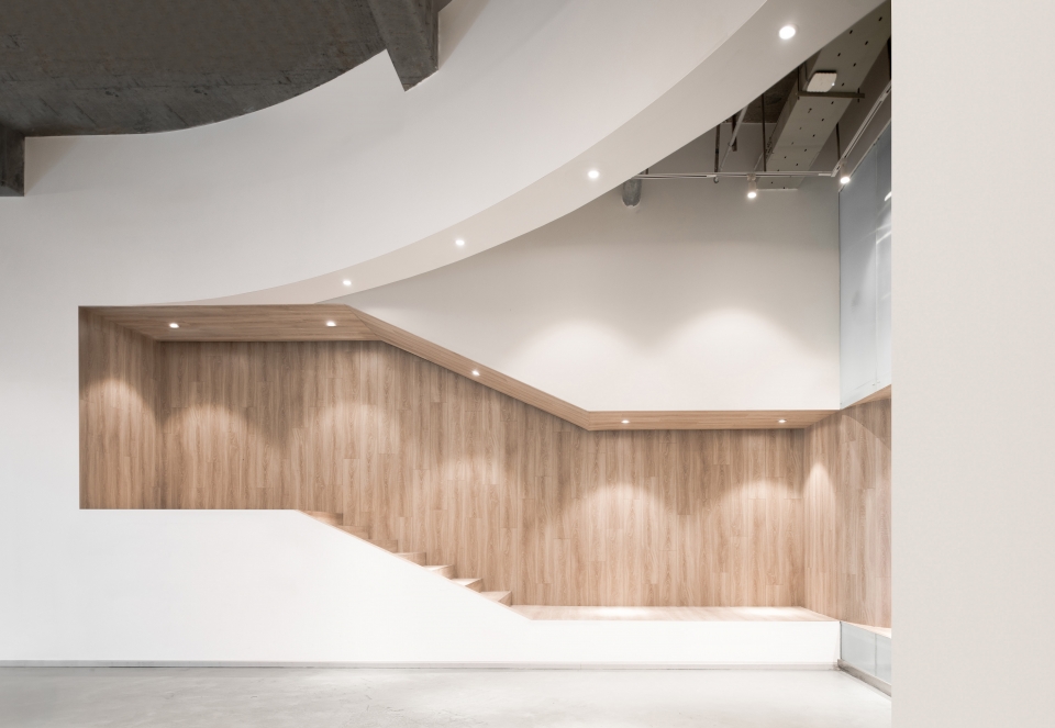 一个公共的演讲空间也被提供在旅社的中央。阶梯踏步与座位合为一体用于主要的被用于公共的观众空间。与此同时,夹层上突出的玻璃盒子与嵌入墙内的活动空间也为住客提供了另一个独立的观众区。旅社内多处使用了弧形的墙体,在提高空间趣味性与亲和力的同时,也为空间增添了层次感。