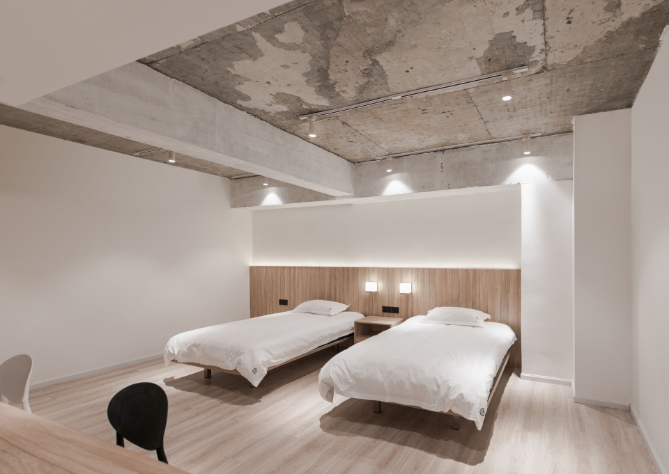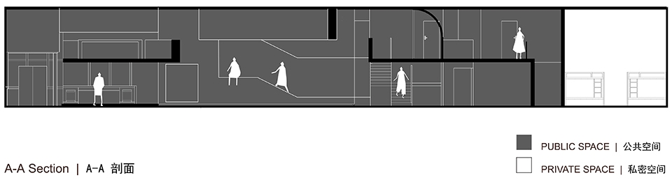 此项目的设计通过打破空间的传统交流方式,来改变住客在此空间内的行为方式,加强住客之间的交流。在旅社的公共空间里,人们的活动和行为没有收到局限,他们可以选择喜欢的方式来利用这个空间。一个空间可根据需求同时被用于走、坐、躺的目的。探索这个空间独特的使用方式也是旅社所提供的另一个体验。