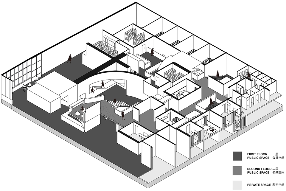 A public lecture and meeting space are designed at the center of the hostel. The stair steps combined with seats and the space inset onto the wall provides a public audience sitting area, whereas the glass box located on the mezzanine provides another private audience space. The organic shapes and curvy walls used repeatedly in this space not only make the space more diverse and friendly, it also catches the ideas of multiple layering.