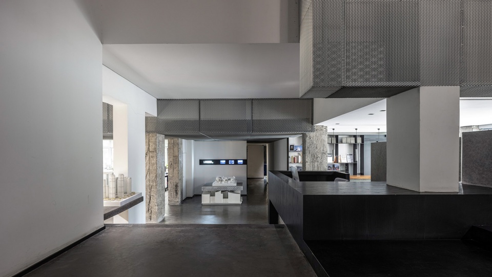 金属作为现代材料介入,纳入素色的体系的同时带来现代的精致感。B区的金属拉伸网从阶梯展厅的隔墙延伸至办公区顶部,又竖立于办公空间尽端的展示书架,在透与不透间营造多层次的空间。灯条嵌入顶部拉伸网间的U型扣条,在纵深上形成序列感。