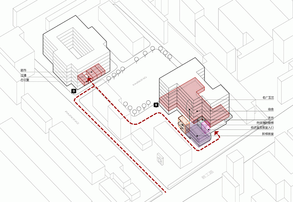 The history of Zhejiang Gongshang University Jiaogong Road Campus in Hangzhou dates back to the 1960s. Like many Chinese universities, the old campus has been transformed into the office parks in the city center under the double attack of urban expansion and the addition of campuses. The ladder classrooms on the ground and second floor of Building B in the campus have been left idle for a long time because their space forms can not correspond to the normal office needs.