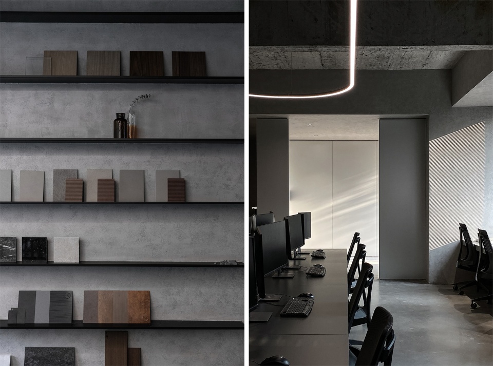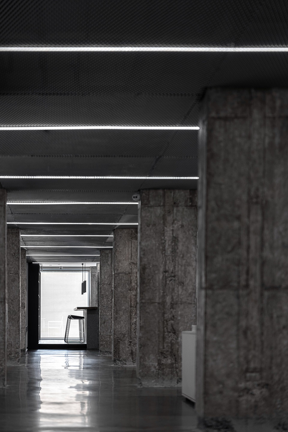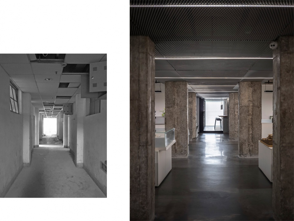 Through the control of materials, colors are reduced and the plain color space of black, white and gray is formed. We remove the original suspended ceiling and the cladding of the beams, columns and ceiling, leaving the rough concrete texture exposed. Plain polished concrete is used on the ground to form a system with the concrete structure and roof. On metope strategy, Area B chooses metope whitewash to form a contrast between white and gray, delicate and bold; Area D uses concrete paint metope to emphasize the integrity of the space.
