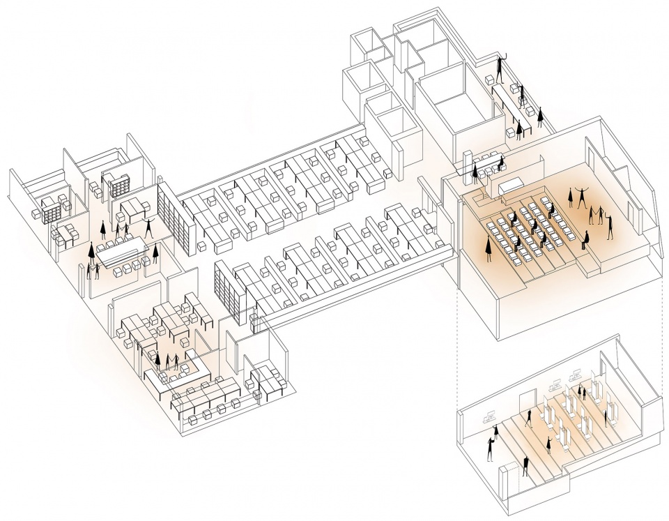 浙江工商大学位于杭州主城区教工路的老校区,历史可追溯至上世纪60年代。同诸多中国高校一样,在城市扩张和校区增设的双重夹击下,老校区蜕变为市中心不可多得的办公园区。而园区内B幢的一、二层阶梯教室,因其空间形式无法对应正常的办公需求而被长期闲置,无人问津,成为新旧转变中遗留下的问题空间。