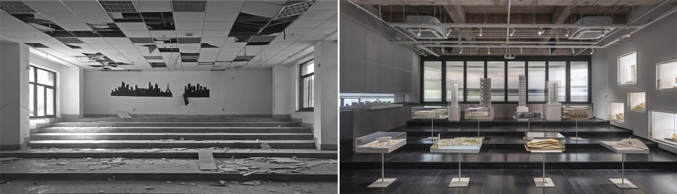 ▼改造前废弃的阶梯教室(左),改造后的多功能展厅(右),Before and after the renovation of the ladder classroom