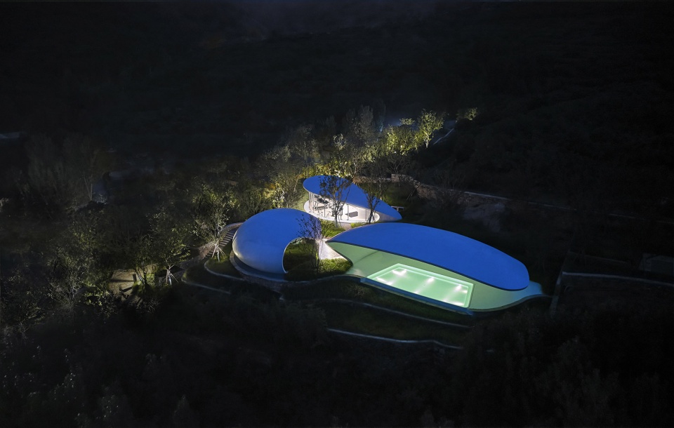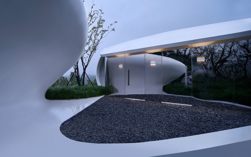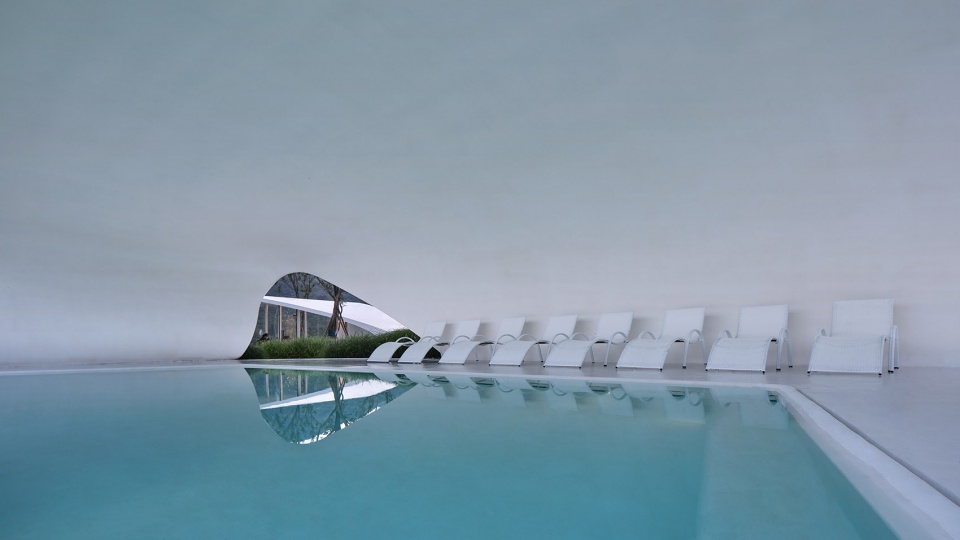 The Bubble Pool intends to create a weakened sense of building volume in the vast mountains. The white special-shaped curved surface forms a free space opening, combined with the large-area transparent facade, and the environmental restoration and landscape transformation of the surrounding mountains, blurring the boundary of inside and outside.