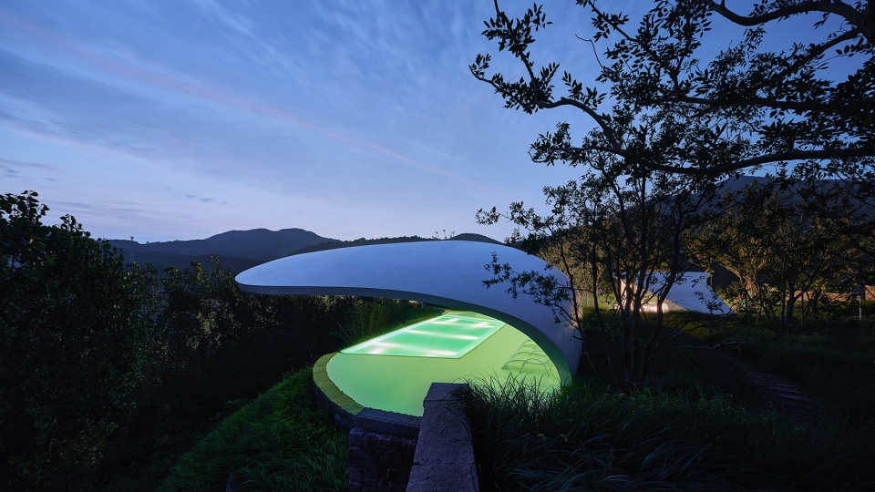 泡池意图在辽阔山色中营造出一种被削弱的建筑体量感。异形曲面的白色形体形成自由的空间开口,结合大面积通透立面,配以周边山体的环境修复与景观改造,模糊了“内”与“外”的场所关系。