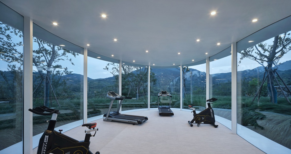 健身房南向开口,开口面以内隐立柱为分隔连接玻璃面墙,被“虚”化的立面揽收村落风光,引入大面积采光,同时限定出具备保温隔热需求的室内健身区域。