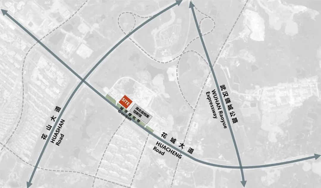 本案则位于武汉东湖高新花山片区,同时在大东湖生态绿楔规划带上,毗邻多个湖泊森林公园,如花山河公园、汽车主题公园、生态农业科普园等,自然景观资源丰富。因此为回应花山新城的整体规划,本案设计师希望以绿色装配式木结构作为主体结构,为这座"绿色样板城”添砖加瓦。